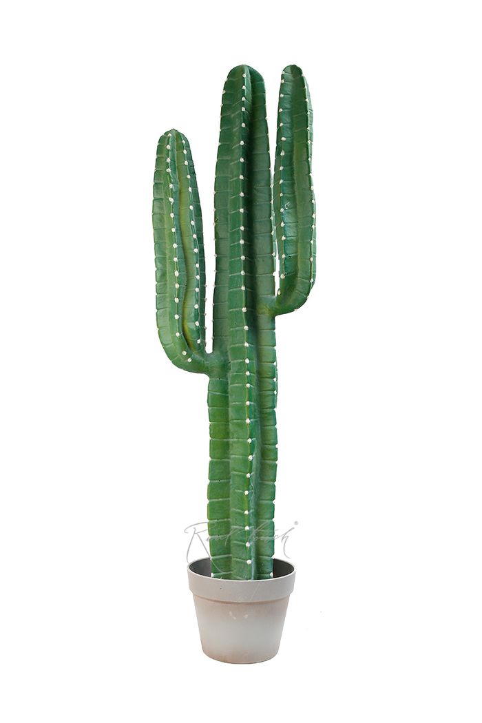 Пластиковый кактус с маленькими белыми иголками. Иглы больше похожи на ворсинки, так как сделаны из очень тонкого пластика. У этого кактуса один основной стебель с несколькими ветвями в верхней части. Надежно посажен в серый технический горшок. Части кактуса неразъемные. Доступен в трех размерах - 141/98/69см.