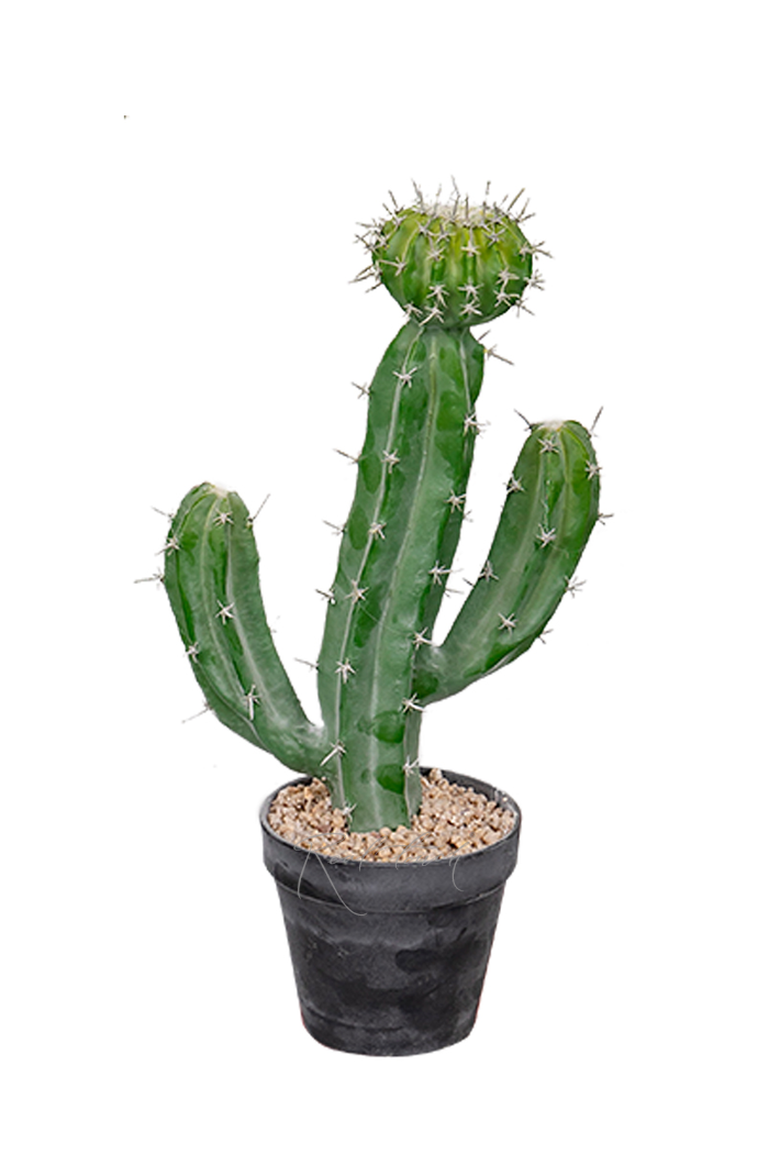 Цельный кактус Цереус Валидус 41см высотой с характерными цилиндрическими ребристыми стеблями и округлой "шапочкой" на центральном стволе. Изготовлен из пластика, пустой внутри, за счет чего достаточно легкий. Напыление ствола, а также часто посаженные светлые иголочки — в точности как у настоящего кактуса. Только наши иголки абсолютно не колючие и даже приятны на ощупь, так как сделаны из силикона. При необходимости для восстановления напыления можно использовать кисть и детскую присыпку. Открытая часть черного технического кашпо декорирована слоем мелких камушек песочного цвета, которые прочно проклеены и не осыпаются. Представлен также в размере 62см.