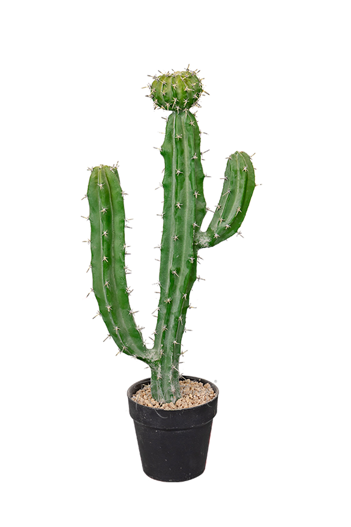 Цельный кактус Цереус Валидус 62см высотой с характерными цилиндрическими ребристыми стеблями и округлой "шапочкой" на центральном стволе. Изготовлен из пластика, пустой внутри, за счет чего достаточно легкий. Напыление ствола, а также часто посаженные светлые иголочки — в точности как у настоящего кактуса. Только наши иголки абсолютно не колючие и даже приятны на ощупь, так как сделаны из силикона. При необходимости для восстановления напыления можно использовать кисть и детскую присыпку. Открытая часть черного технического кашпо декорирована слоем мелких камушек песочного цвета, которые прочно проклеены и не осыпаются. Представлен также в размере 41см.