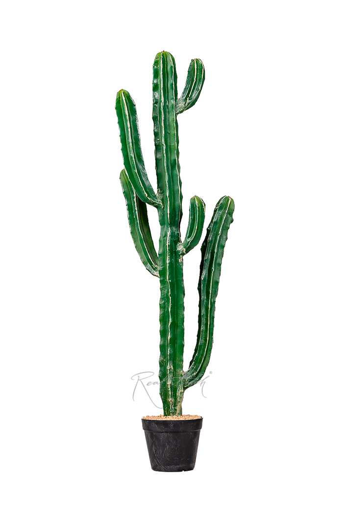 Цельный кактус Цереус Ямакару 105см высотой с характерными цилиндрическими ребристыми стеблями. У кактуса один основной ствол и несколько ответвлений он него. Изготовлен из пластика, пустой внутри, за счет чего достаточно легкий. Все детали в точности как у настоящего кактуса: переход цвета, напыление стволов, а также выпирающие бугорки-иголки. При необходимости для восстановления напыления можно использовать кисть и детскую присыпку. Открытая часть черного технического кашпо декорирована слоем мелких камушек песочного цвета, которые прочно проклеены и не осыпаются. Данный кактус представлен также в размере 147см.
