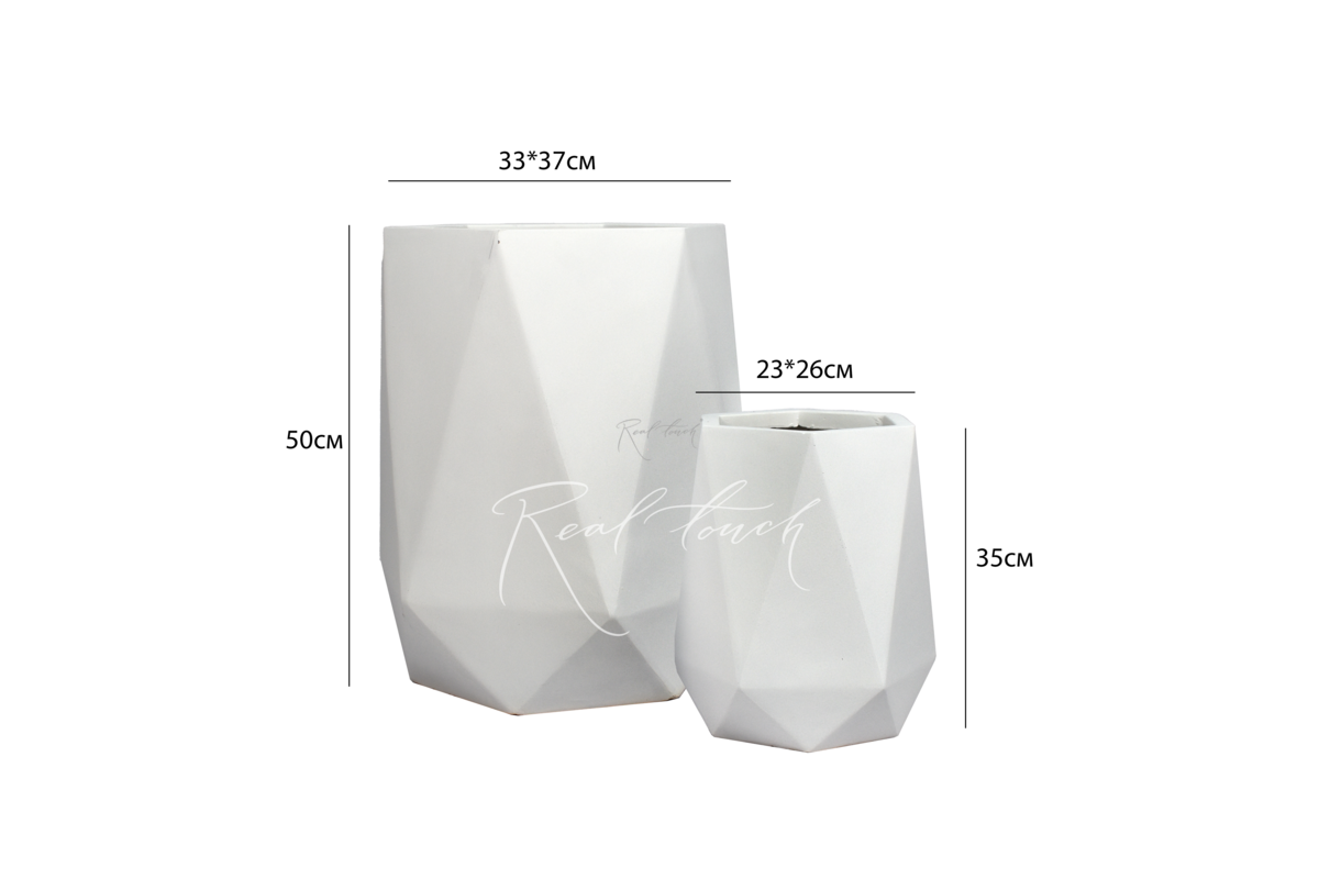 Лаконичное кашпо из файберклэя в форме многогранника . Диаметр кашпо - 33 см, высота - 50 см. Вес - 7,25 кг. Стандартная упаковка - набор из 2-х кашпо. В набор входит 2 размера по 1 штуке: M - 23/26х35 см; L - 33/37х55 см. Доступно к покупке поштучно.