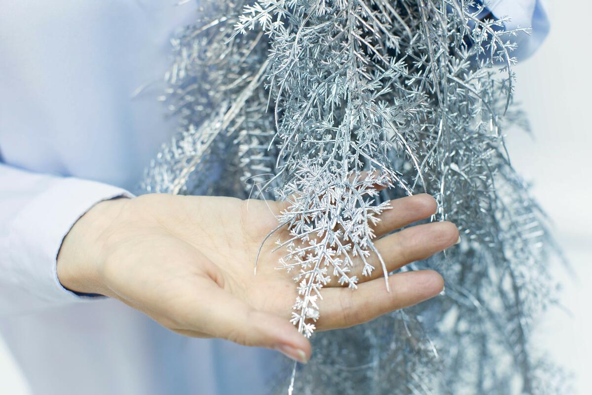 Материал изготовления - плотный силикон, который мягче и приятнее пластика. Отличительной особенностью пористого аспарагуса является его "воздушная" хвоя. Она выглядит легче и объемнее, чем хвоя обычного аспарагуса. Прокраска хвои серебром - необычное решение! Серебряный аспарагус перехватывает соседние цвета, отражая основной оттенок. Он будет отличным акцентом в вашем декоре, а также станет незаменимым решением в оформлении новогодних/зимних композиций.