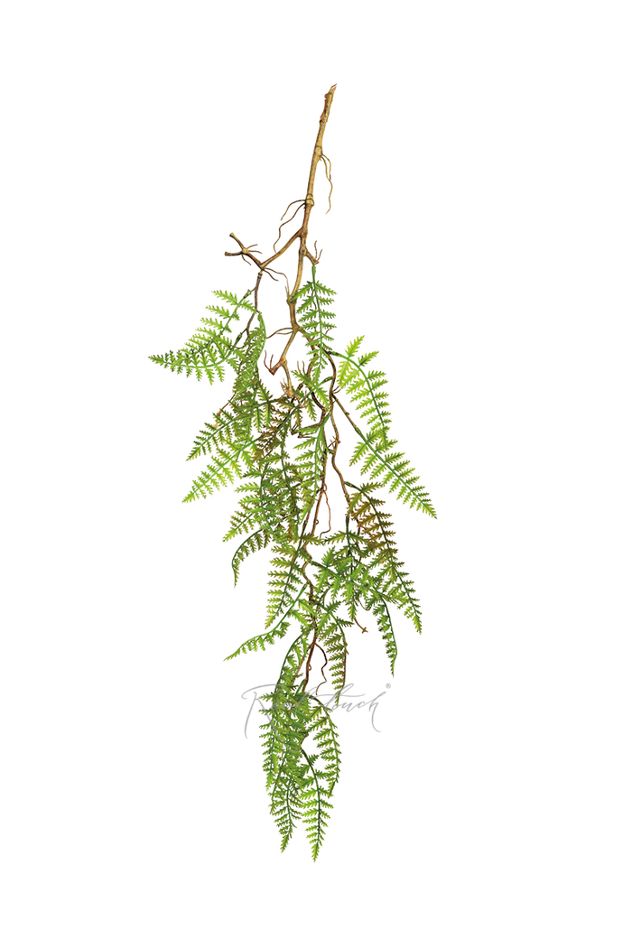 Даваллия в ассортименте Real Touch представлена на одревесневшем стебле в виде миниатюрного ампельного кустика. Листочки и стебель выполнены из мягкого пластика. Листовая часть составляет 70 см из общей длины 100 см. Листочки достаточно обособлены, к стеблю крепятся небольшими отдельными ответвлениями, внутри которых идет проволока. Часть листьев имеют легкий зелено-коричневый градиент, который придает им эффект натуральности - как будто бы листочки чуть подсушились на солнце.
