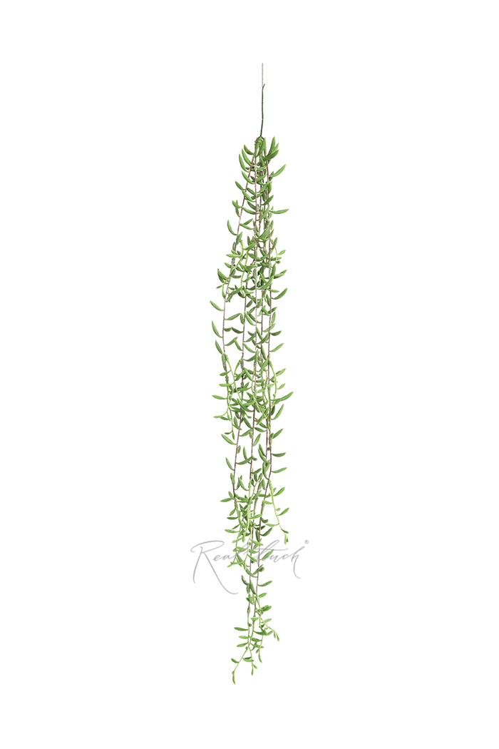 Растение напоминает суккулент своими мясистыми листочками. Они при внешней хрупкости очень плотные, крепко держатся на основной ветке. Длина растения 105 см зеленая часть + 20 см ножка, состоит из 5-х отростков: 2 по 105 см, 3 по 60см. Восхищает, насколько продуманы детали: цвет стебля и градиента оттенков, толщина листиков и их размер. Веточки не приклеены к основанию, поэтому легко разбираются, а из-за своей формы они цепляются друг за друга и могут отпадавать от основания. Рекомендуем подклеивать ,если клиенту не нужно разбирать на отдельные "ниточки".