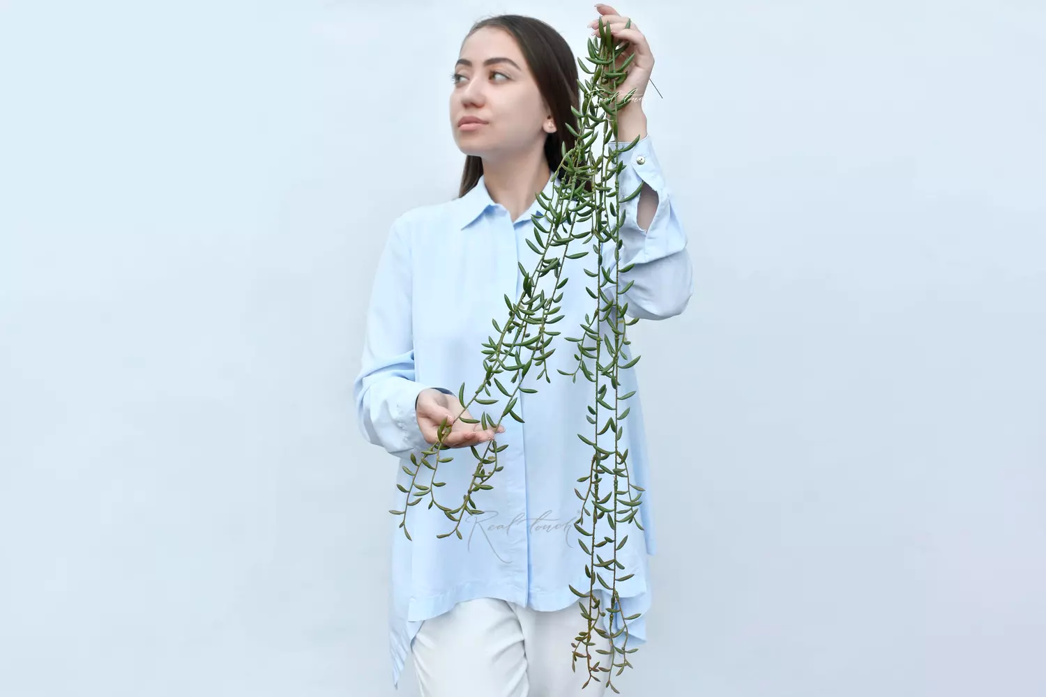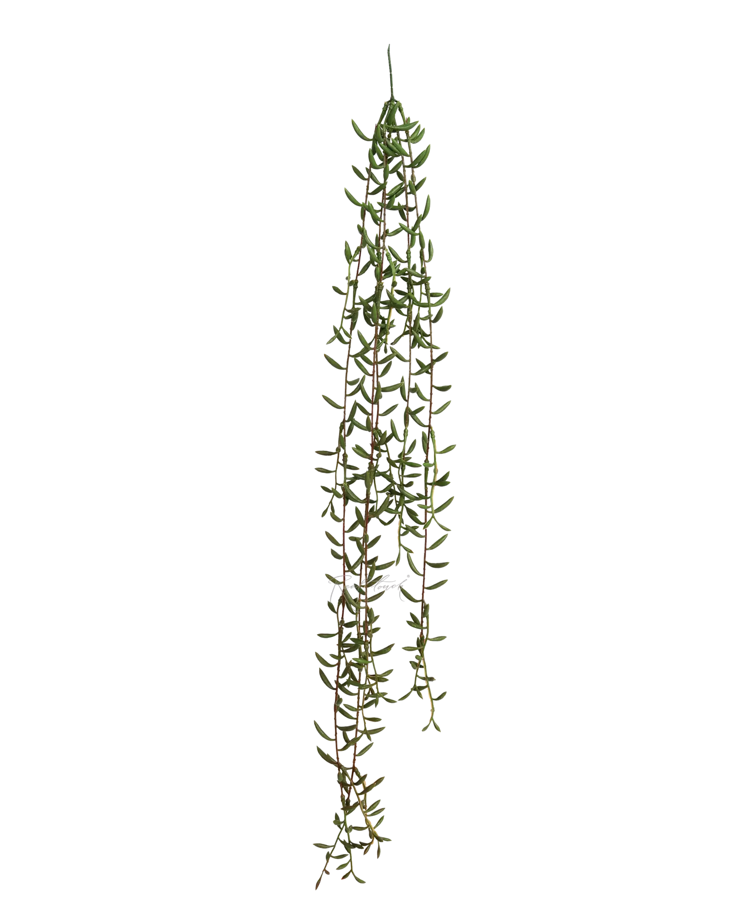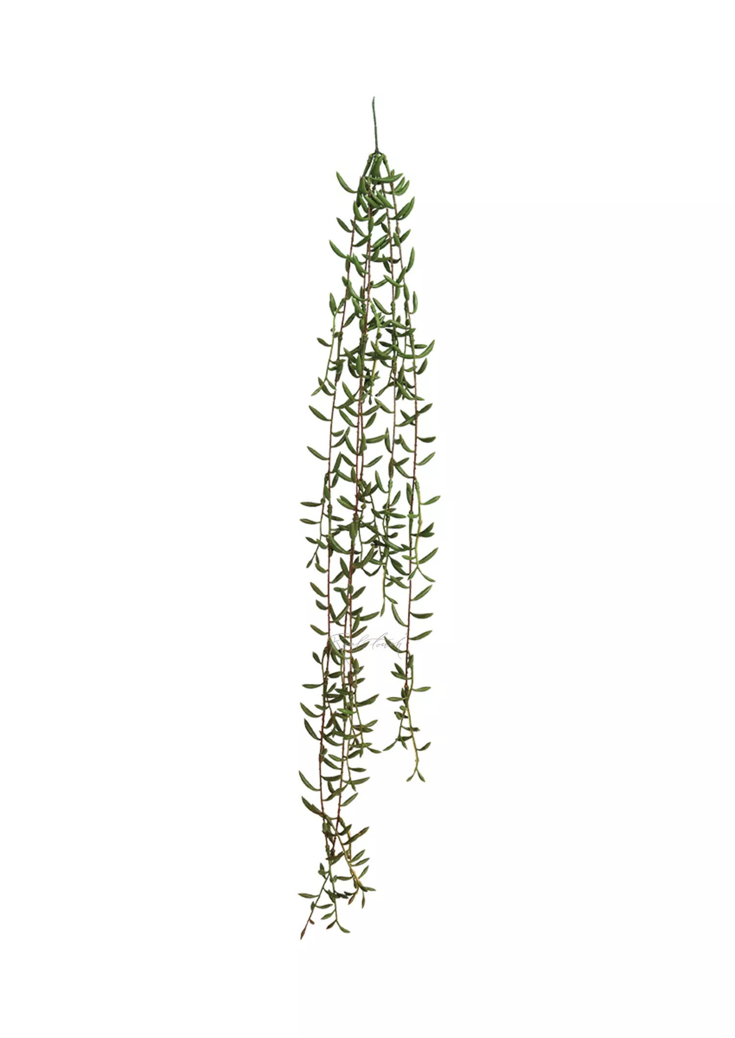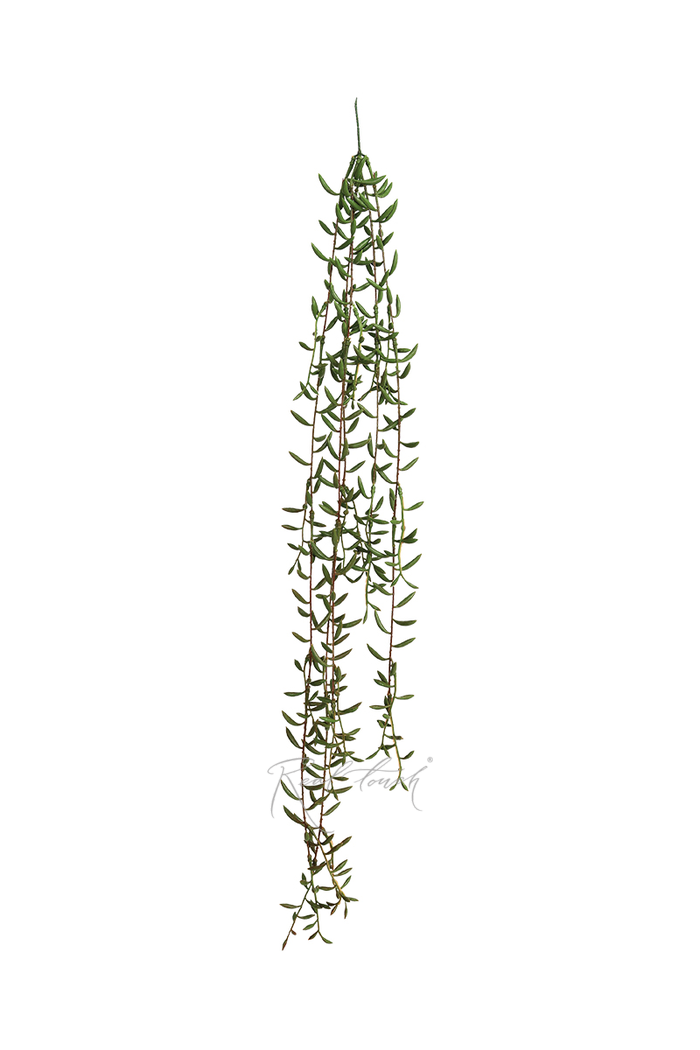 Растение напоминает суккулент своими мясистыми листочками. Они при внешней хрупкости очень плотные, крепко держатся на основной ветке. Длина растения 105 см зеленая часть + 20 см ножка, состоит из 5-х отростков: 2 по 105 см, 3 по 60см. Восхищает, насколько продуманы детали: цвет стебля и градиента оттенков, толщина листиков и их размер. Веточки не приклеены к основанию, поэтому легко разбираются, а из-за своей формы они цепляются друг за друга и могут отпадавать от основания. Рекомендуем подклеивать ,если клиенту не нужно разбирать на отдельные "ниточки".