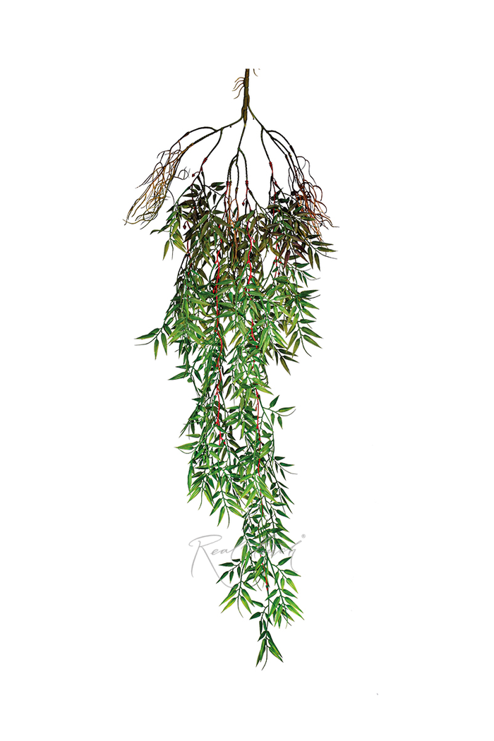 Материал – мягкий пластик, приятный на ощупь. Листочки достаточно мелкие, чем-то похоже на листву ивы. Прокраска с легким градиентом у верхушки от коричневого к зеленому. Отличительной особенностью является, безусловно, цвет стебля – красный. Данное решение может стать отличным акцентом в общей зеленой композиции. По длине веточек нет проволоки. Также у основания есть коричнево-красные корешки.