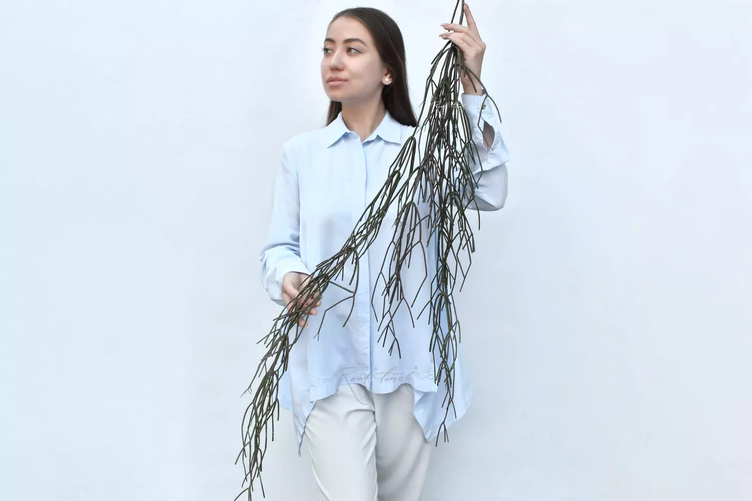 Рипсалис — уникальное суккулентное растение, которое выделяется своими побегами в виде небольших прутиков. Рипсалис Real Touch выполнен из твердого пластика, ножка крепление из бумажной оплётки, внутри которой идет проволока. Кустик коричневого цвета с оттенками зеленого и белыми точками по всей длине.