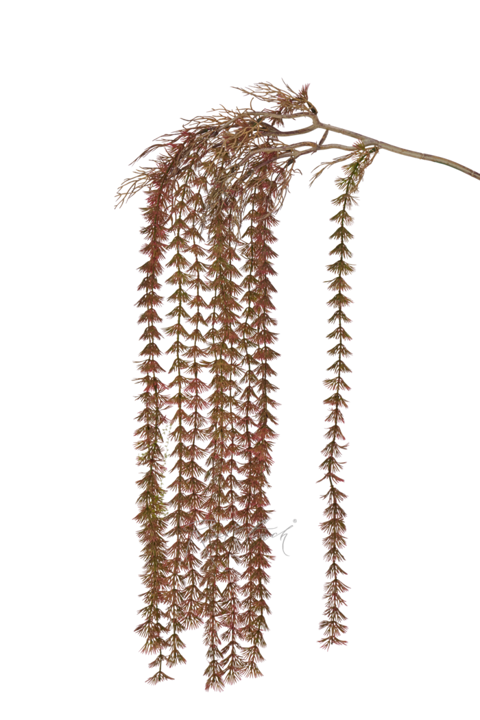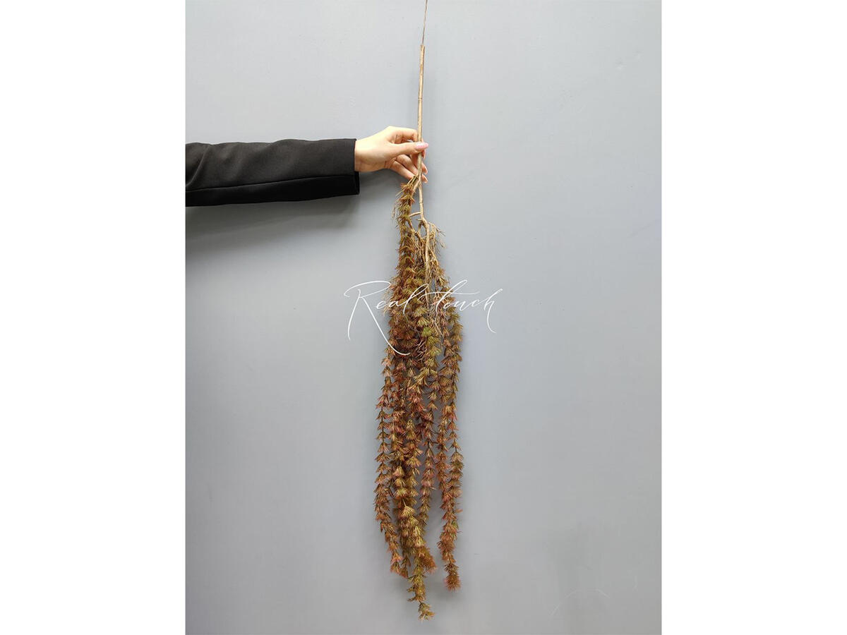Ампельная лиственница Real Touch очень изящная и необычна по своей фактуре. Состоит из 11 зеленых веточек длинной 55 см каждая. Листики похожи на объемные хвойные юбочки, которые спускаются вдоль всей длины веточке. Ответвления, которые идет от основного стебля, расположены на разной высоте, поэтому общая длина зеленой части достаточно большая - 80 см, сам стебель - 20 см + 6 см проволока.