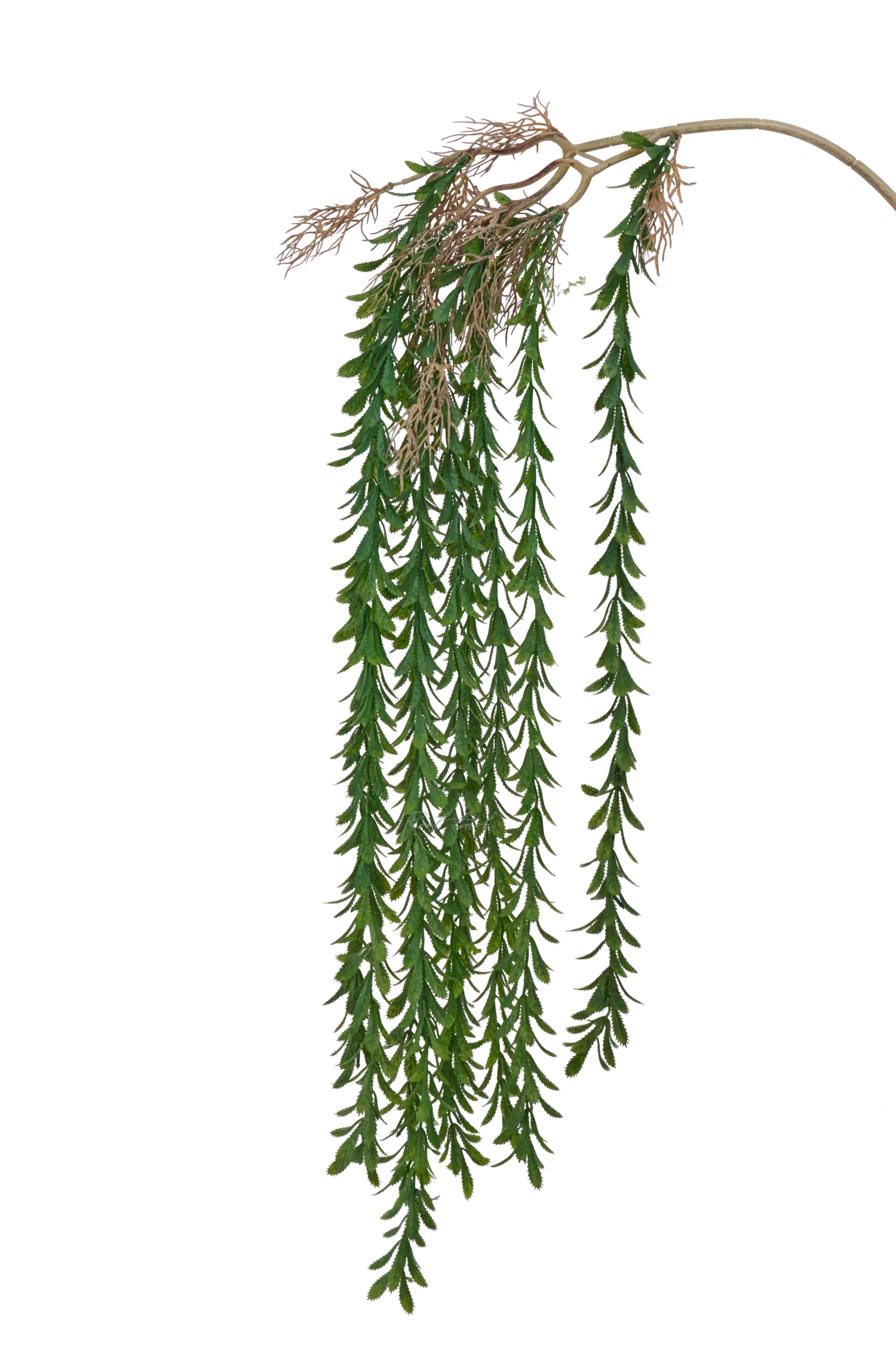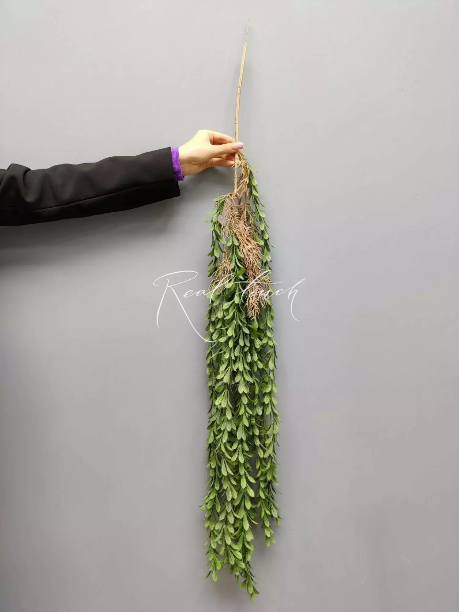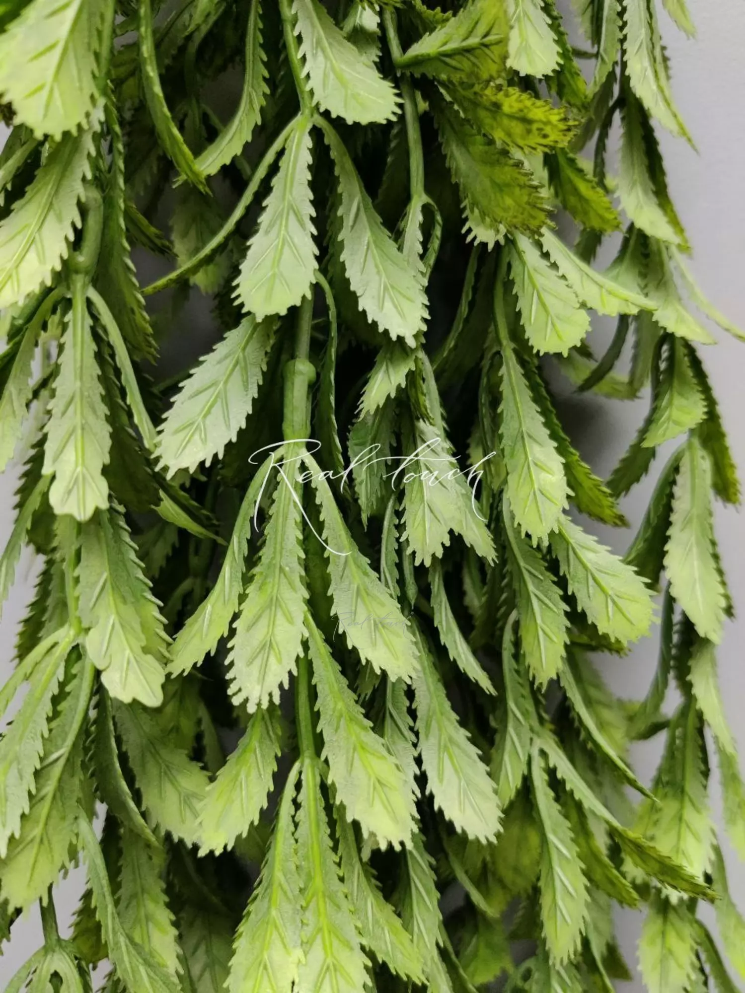 Ампельная зелень очень необычна со своими каплеобразными листьями, по краю которых расположены зазубрины. Немного хищное, но при этом изящное. Состоит из 11 зеленых веточек длинной 60 см каждая. Так как веточки расположены на разной высоте, общая длина зеленой части - 85см, веточка - 20см + 6см проволока. Ширина - 18см. Веточки разбираются по длине, при желании можно укоротить, не обрезая или удлинить! Важно отметить, что веточках нет проволоки и сам пластик не гибкий, поэтому нужно быть осторожными, когда расправляете.