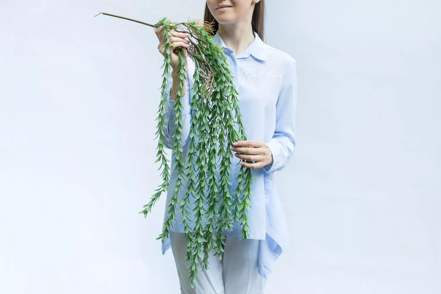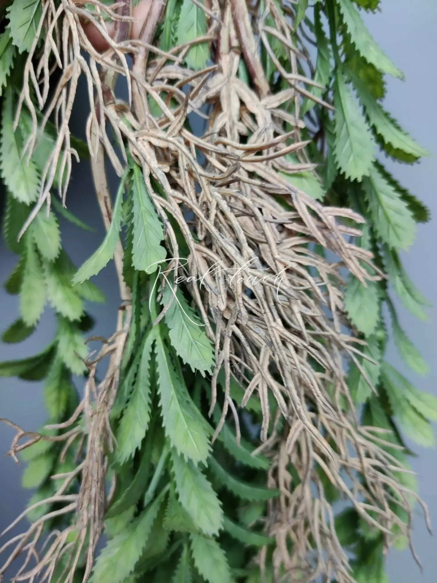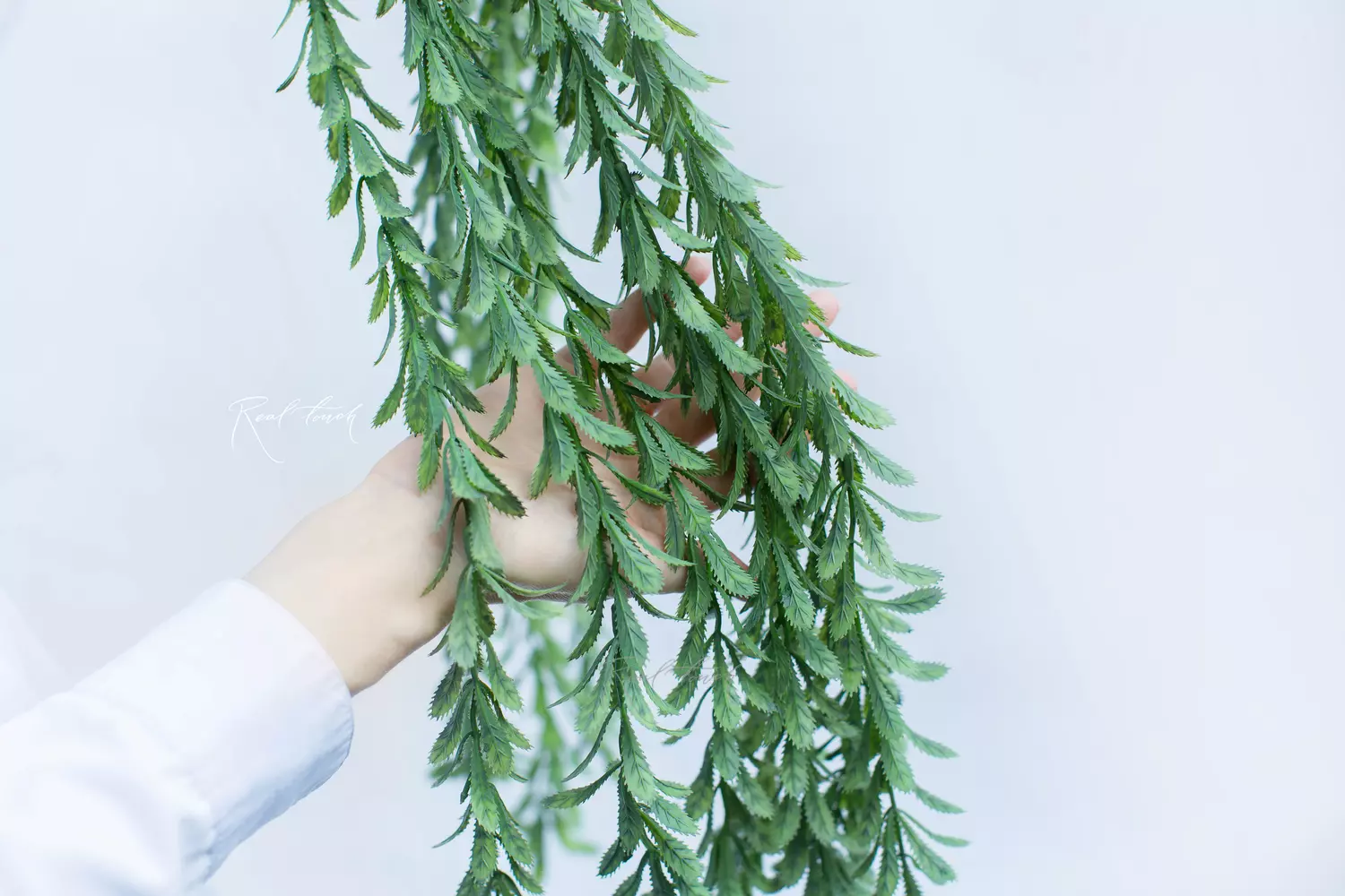 Ампельная зелень очень необычна со своими каплеобразными листьями, по краю которых расположены зазубрины. Немного хищное, но при этом изящное. Состоит из 11 зеленых веточек длинной 60 см каждая. Так как веточки расположены на разной высоте, общая длина зеленой части - 85см, веточка - 20см + 6см проволока. Ширина - 18см. Веточки разбираются по длине, при желании можно укоротить, не обрезая или удлинить! Важно отметить, что веточках нет проволоки и сам пластик не гибкий, поэтому нужно быть осторожными, когда расправляете.