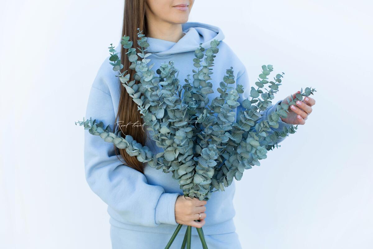 Куст эвкалипта с пыльно-зелёными листьями идеально подходит для масштабных букетов, интерьерных ваз, свадебных композиций и декоративных инсталляций. Его можно использовать как самостоятельный акцент или комбинировать с другими декоративными растениями для создания сложных, многослойных композиций.