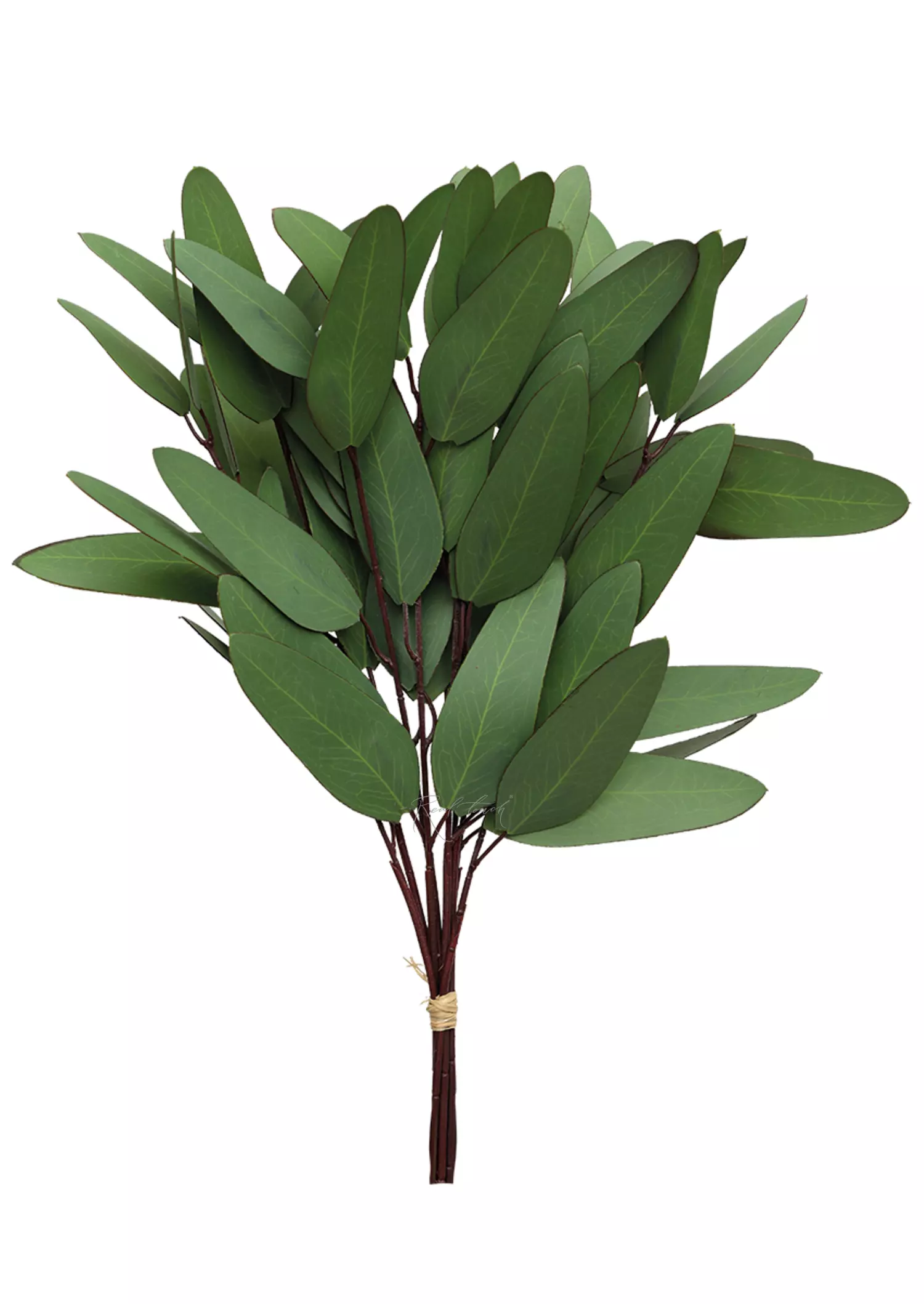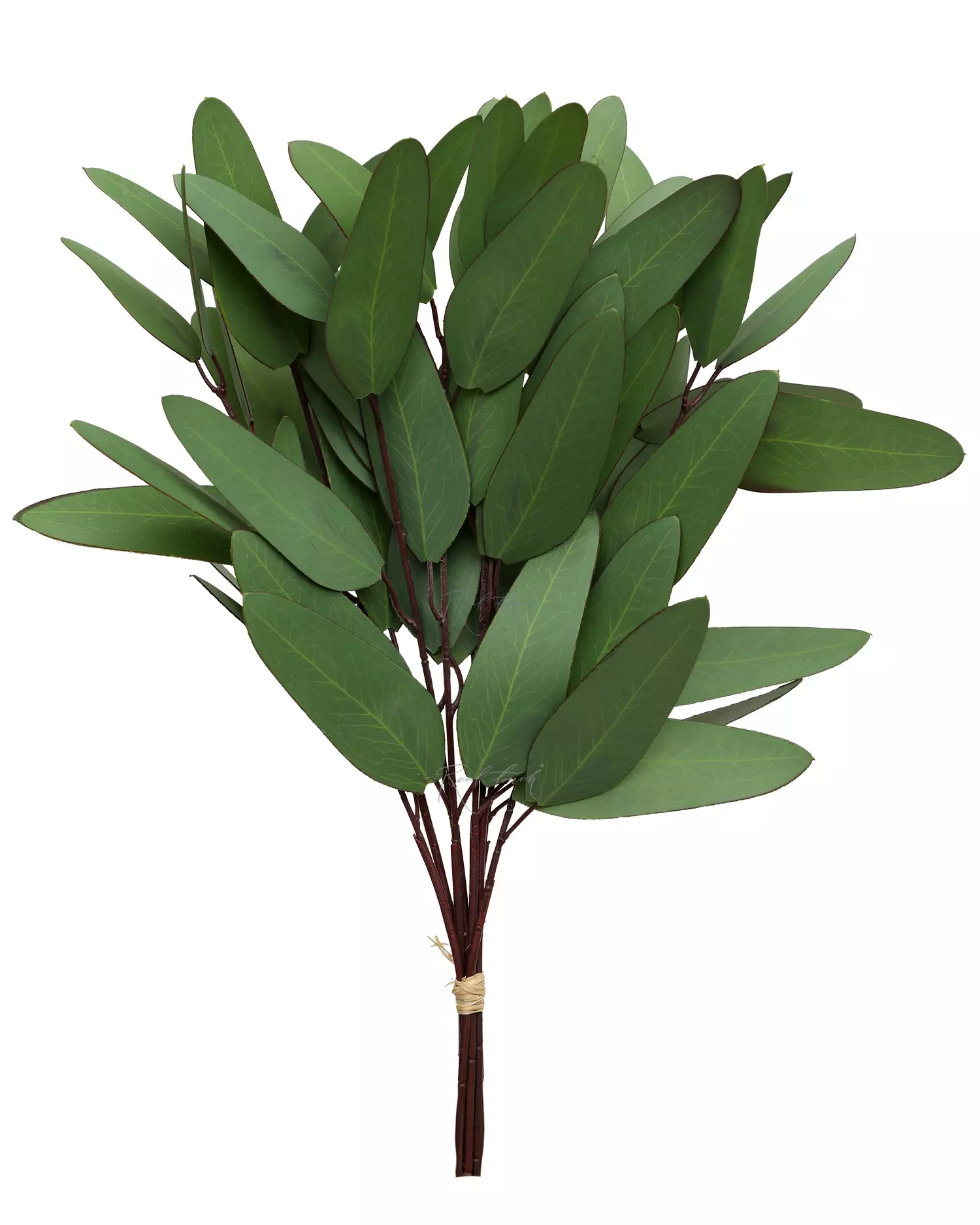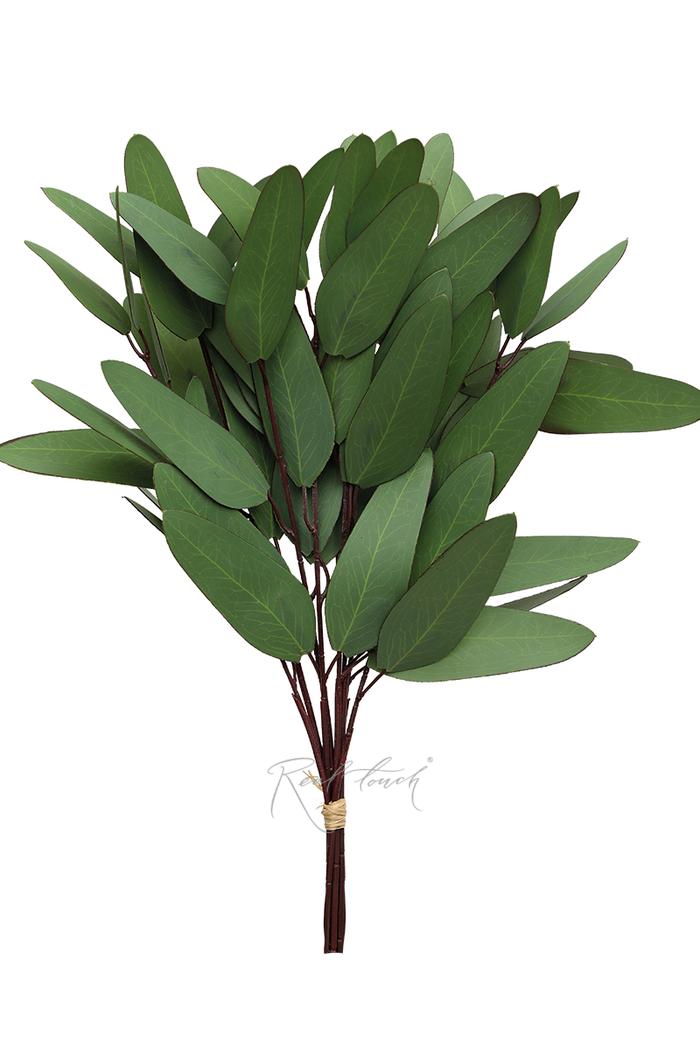 Пучок состоит из 8 веточек с вытянутыми овальными листьями, выполненными из водонепроницаемого полимерного волокна. Листья имеют насыщенный тёмно-зелёный оттенок с реалистичной имитацией светлых прожилок с обеих сторон, что придаёт им натуральность. Бордовая окантовка по краям листьев добавляет выразительности и глубины цвету.