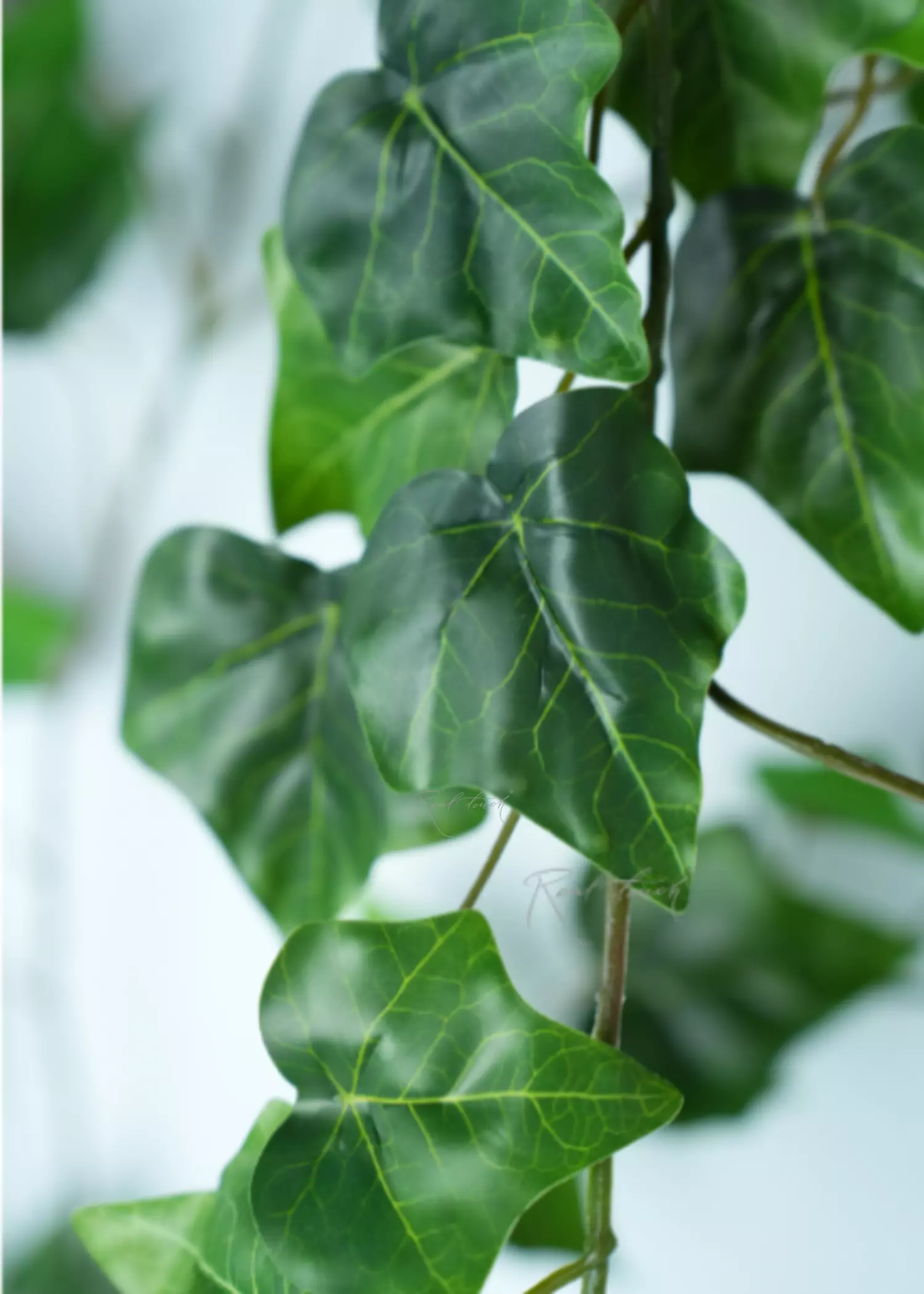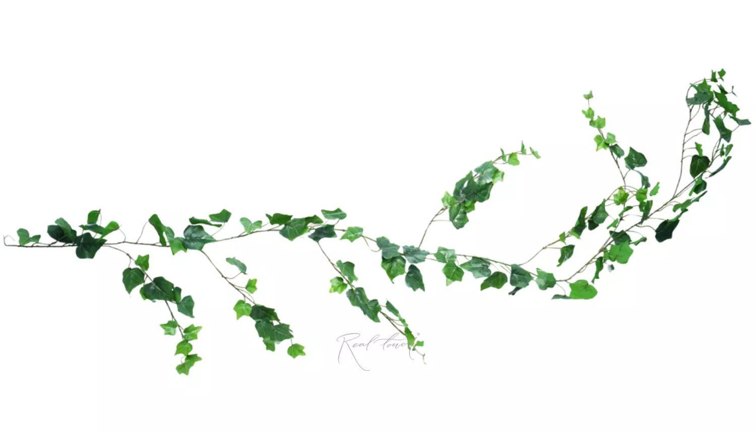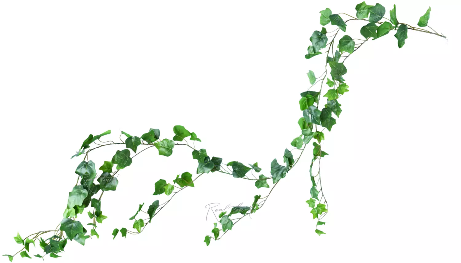 Плющ 180 см - представлен в виде длинной и извилистой лианы, с небольшими ответвлениями с листочками. Листья выполнены из водонепроницаемого волокна с 3D печатью прожилок. На внутренней стороне есть небольшие усилители, которые помогают листику держать форму. Листья имеют насыщенный темно-зеленый окрас, небольшие листочки на концах ответвлений чуть светлее, чем основная листва. Данное решение придает плющу реалистичность и естественность.