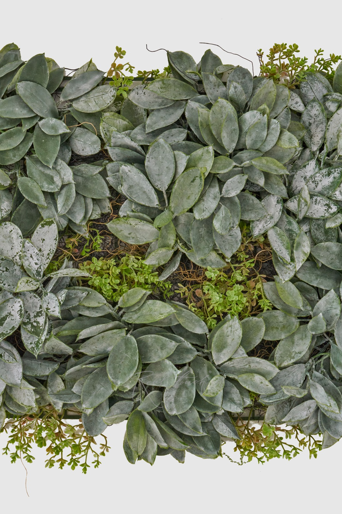 Данное панно - аналогично панно с папоротником. Размеры технической основы 39,5*59,5, но листья выступают за край, поэтому округлим до 40*60см, высота 5-6см.В основе пластиковая сетка, на которой закреплена пластиковая основа (похожая на сухую траву), а уже потом крепится листва. Материал - мягкий пластик, но на ощупь очень близко к плотному силикону. Листва достаточно густая, напоминает растение Хоста. Цвет зеленый с белесым напылением, которое преобразует листву, делая ее более объёмной и живой. Между листиками есть веточки, которые похожи на мелкие суккуленты, они прекрасно дополняют основу. Такое панно удобно крепить и за ним легко ухаживать. Из такого панно можно сделать стену или использовать его с другими растениями в качестве одно из элементов декора.