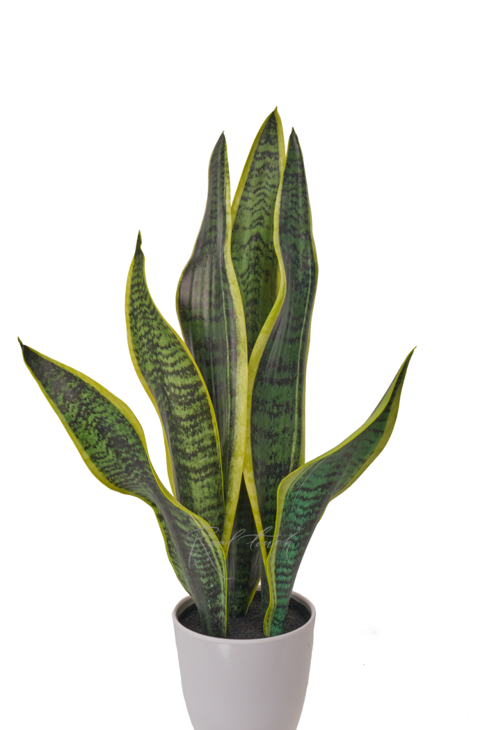 Листья выполнены из плотного силикона с 3D печатью. Плотный материал позволяет листьям отлично держать волнообразную форму, их не нужно расправлять и направлять, растение приходит сразу "готовое". Листья с реалистичной прокраской, характерной для сансевиерии: темно-зеленые листья с тигровыми полосками и с желтой окантовкой. Также реалистичность создается благодаря разным размерам листьев, кустик состоит из 3 пучков по 8 листьев: 3 больших, 2 средних и 3 малых.