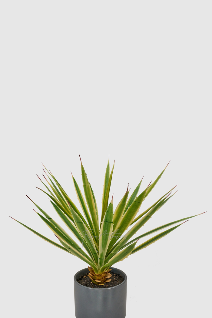 Данная модель юкки сразу представлена не в техническом, а в декоративном керамическом кашпо темно-серого цвета, то есть это готовый продукт для ваших клиентов. Общая высота 37см в расправленном виде, диаметр 35см. Эти размеры включают высоту кашпо 10см, его диаметр 11,5см. Листья у агавы длинные и тонкие, словно иглы дикобраза, с зубчиками по краям. Материал - мягкий пластик. На обратной стороне присутствуют продольные технические полосы, на которые следует обращать внимание клиентов.