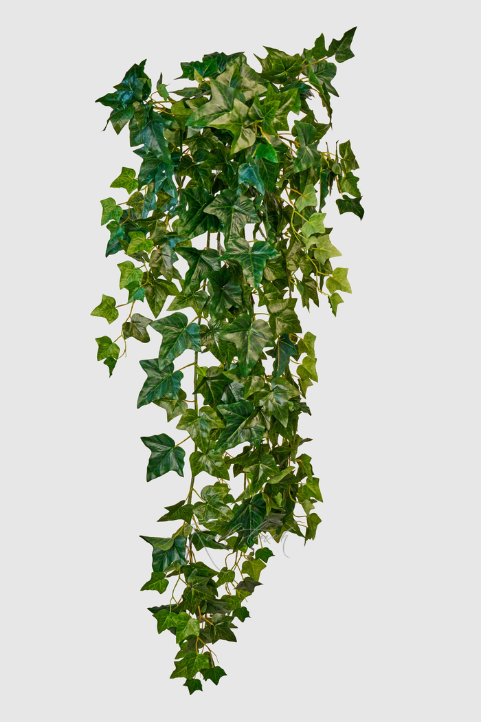 Листья плюща выполнены из текстиля с детально проработанной текстурой и реалистичной печатью прожилок, благодаря чему они выглядят как живые. Глубокий тёмно-зелёный оттенок с лёгкими переходами цвета придаёт растению выразительность и делает его настоящим украшением любого пространства. Листья расположены равномерно по всей длине плюща, создавая плотный и гармоничный вид.