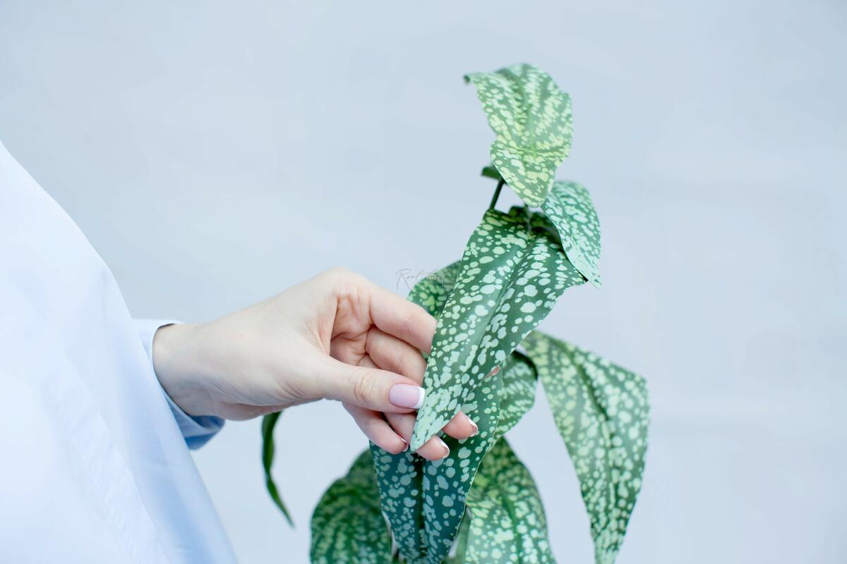 Листья имеют уникальный пятнистый рисунок, сочетающий светлые и тёмные оттенки зелёного, что делает растение ярким акцентом в любой композиции.