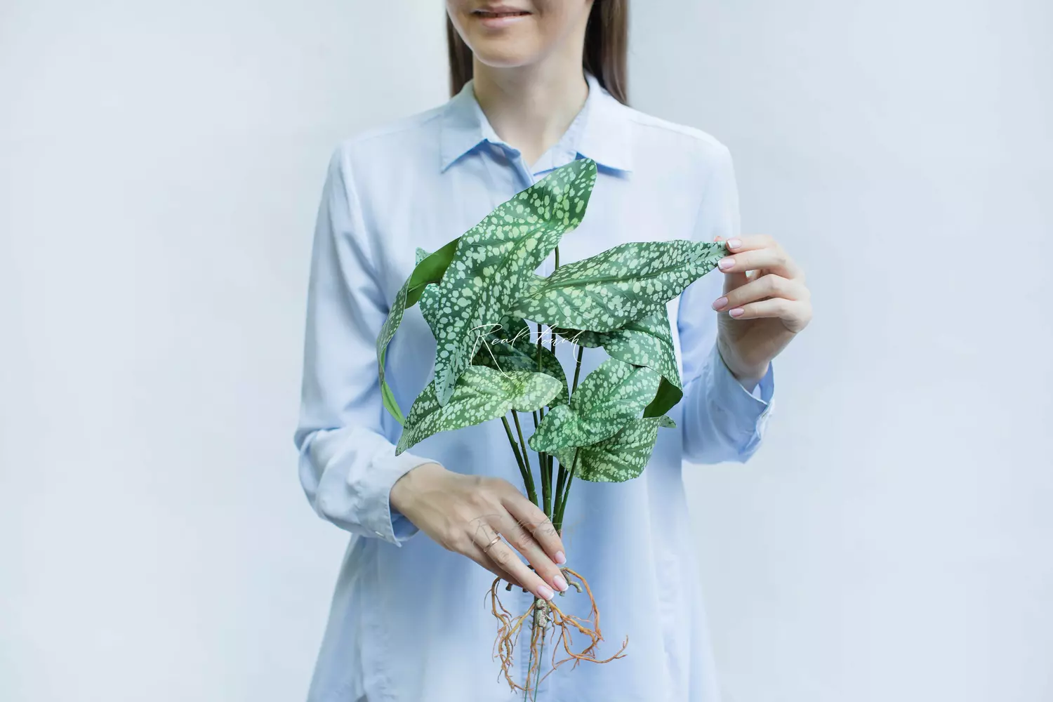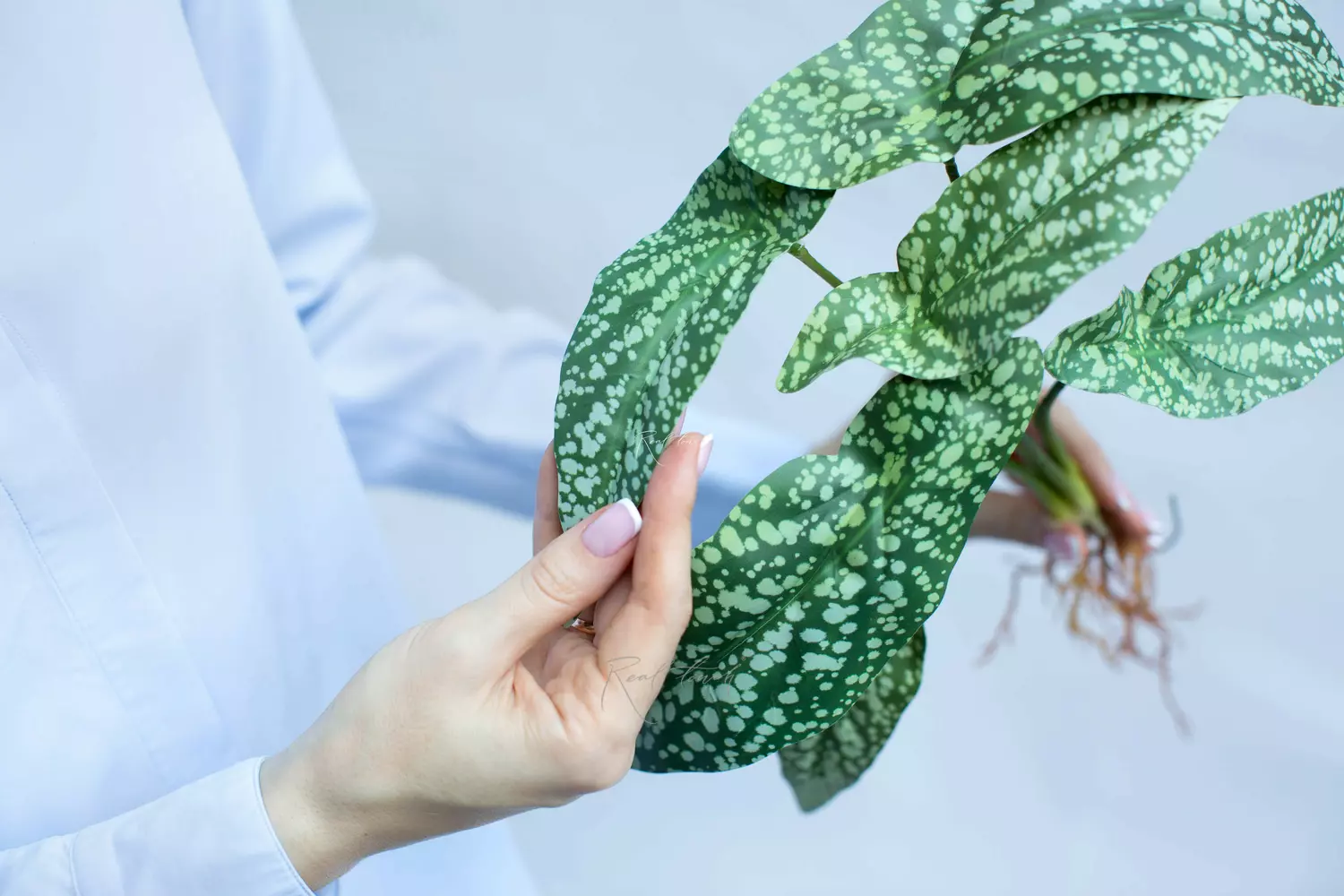 Листья имеют уникальный пятнистый рисунок, сочетающий светлые и тёмные оттенки зелёного, что делает растение ярким акцентом в любой композиции.