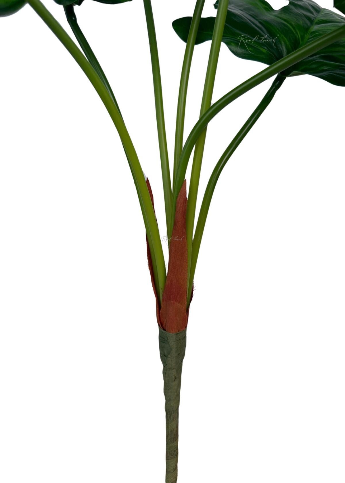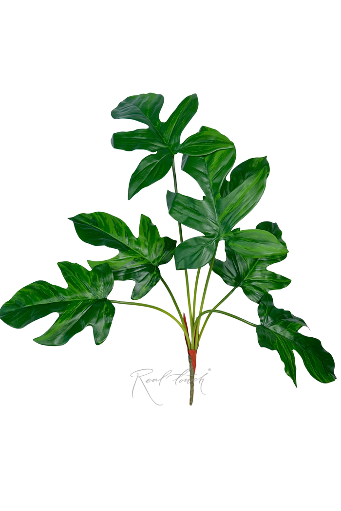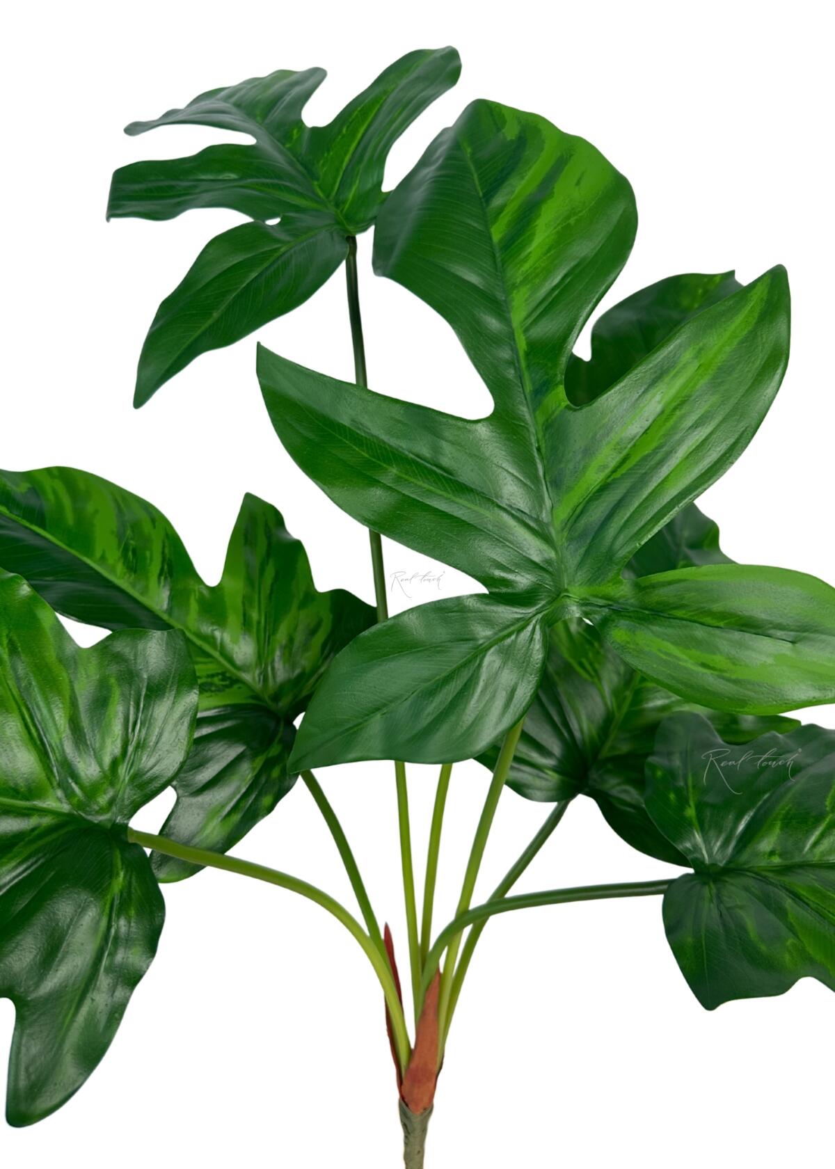 Куст Филодендрона Лациниатума состоит из 7 листьев разного размера. От 21см. до 24см. в длину. Ножка 17 сантиметров, в переплёте. У стебля окраска неоднородная, с переливом от светло-зеленого до темно-зеленого. Интересная форма листа, гладкий и плотный, как у кустиков монстеры. У основания присутствует тканевая имитация сухих листьев, которая усиливает эффект натуральности. Сами листья окрашены в цвета от светло-зелёного до тёмно-зелёного