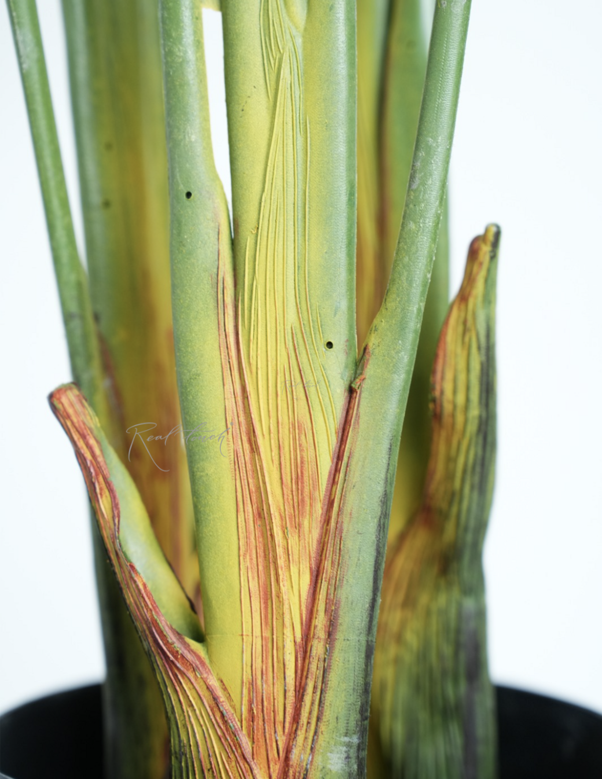 Стебли плотные, выполнены из пластика. У основания имеют светло-зеленый градиент, а также имитацию сухих листьев желто-коричневого цвета.