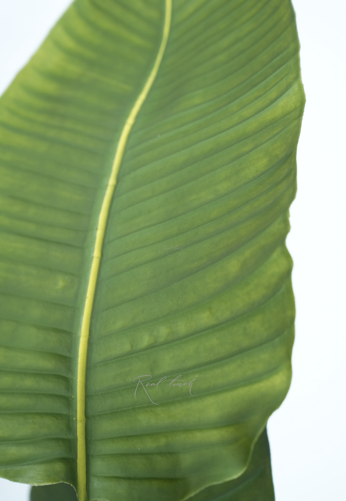 Отличительной и самой главной изюминкой данной стрелиции являются её листья, которые выполнены из плотного силикона. Силикон придает широким, овальным листьям плавные, естественные изгибы, а также позволяет сохранить им тактильную реалистичность. Ребристые листья имеют приглушенный зеленый окрас, по центру идет светло-зеленая прожилка. Листья имеют разные размеры, у основания листья небольшого размера, чем выше - тем больше лист. Вдоль листа идет проволока, которая позволяет задать каждому листу индивидуальные изгибы.