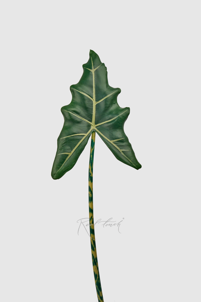 Алоказия Frydek - это растение с необычными листьями, которые имеют ярко-зеленый окрас с серебристо-зелеными прожилками. Форма листьев напоминает широкие наконечники стрел, что добавляет растению экзотичности. В коллекции Real Touch 3 размера листьев: 85см, 108см, 115см. Самый маленький лист 28см, средний 40см, большой 50 см в длину. Лист характерной формы, гладкий со слегка подкрученными краями, материал – водонепроницаемое полотно с 3D печатью. Особого внимания заслуживает стебель необычного пятнистого окраса: салатовое основание с темными хаотичными пятнышками. Стебель расширяется к низу, его будто только срезали с большого куста.