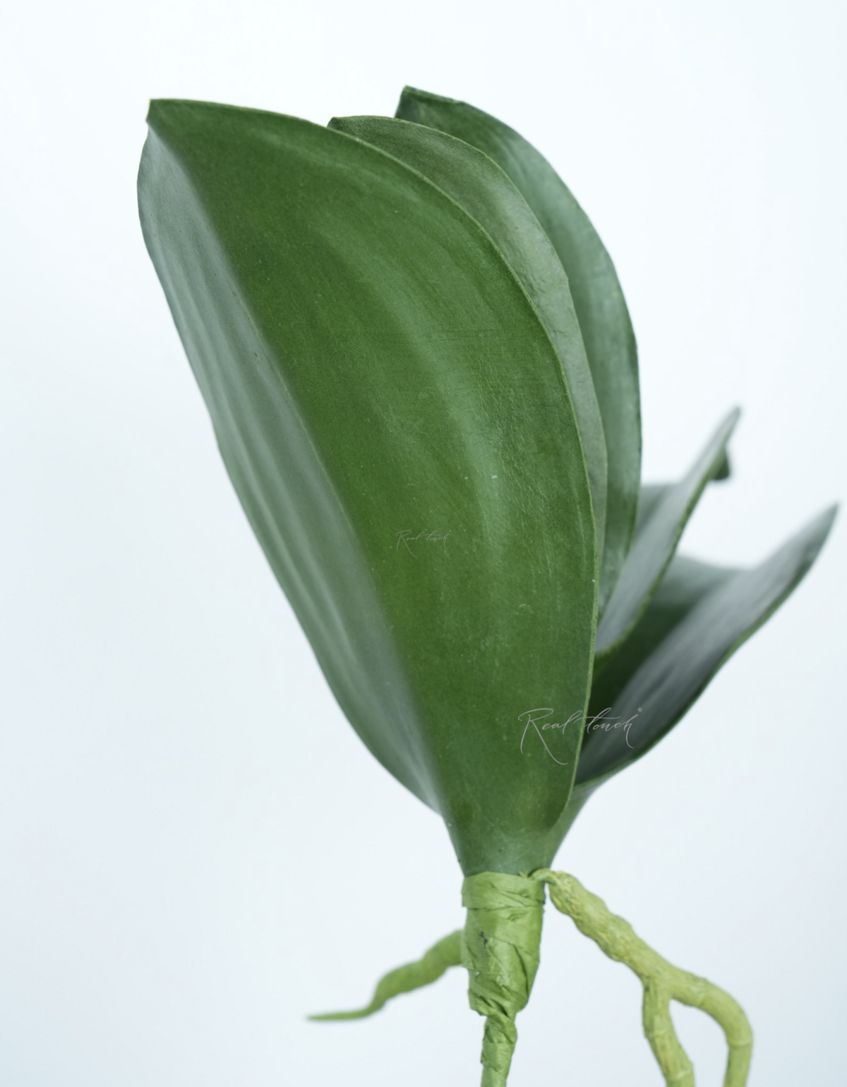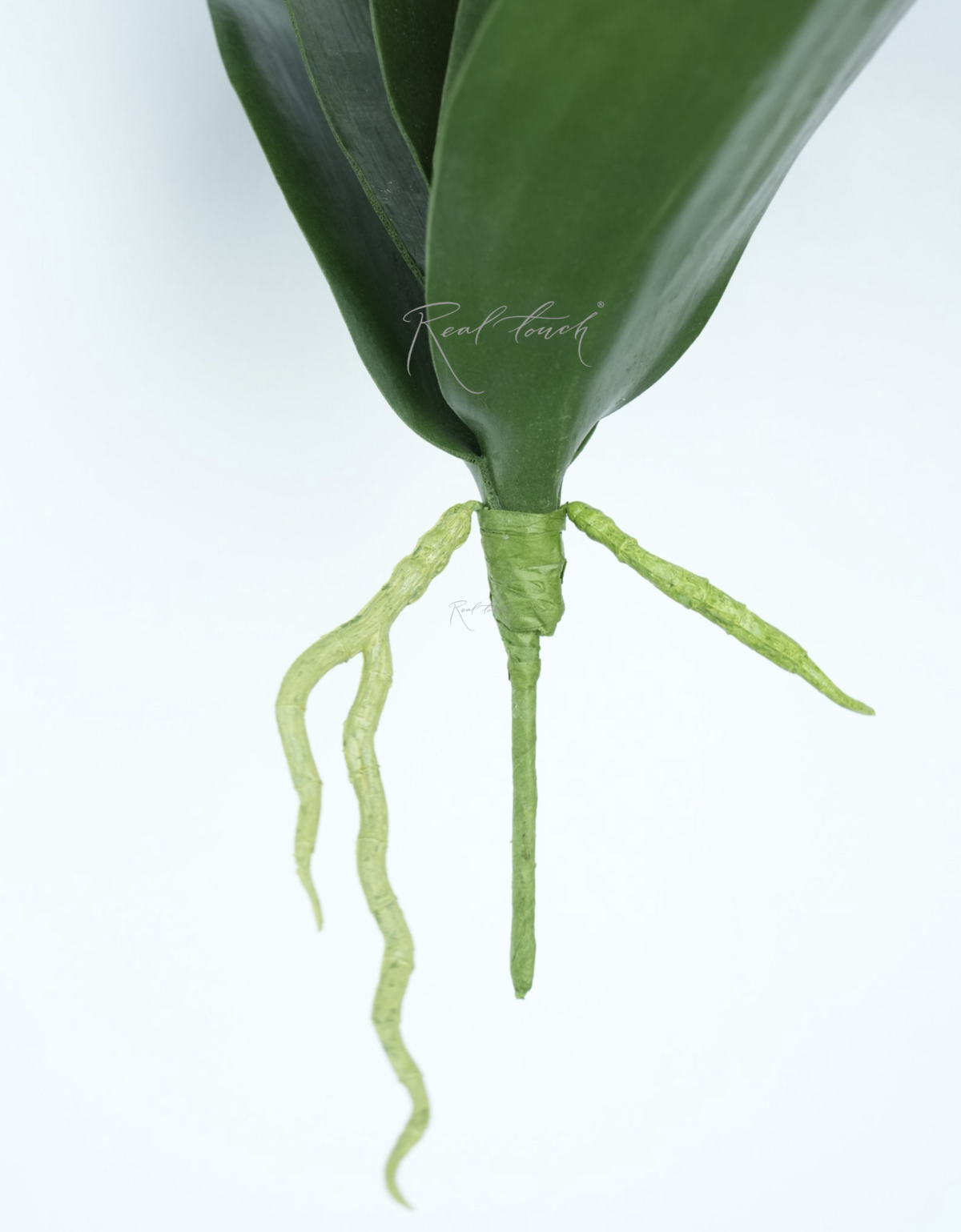 Ножка-крепление имеет металлическую основу, которая сверху имеет бумажную оплетку. Отличительной особенностью всех листов орхидей Real Touch является наличие небольших реалистичных корешков у основания листьев. Данная позиция не стала исключением: корешки выполнены из мягкого пластика, извилистые, с ответвлениями, по прокраске чуть светлее самих листьев.
