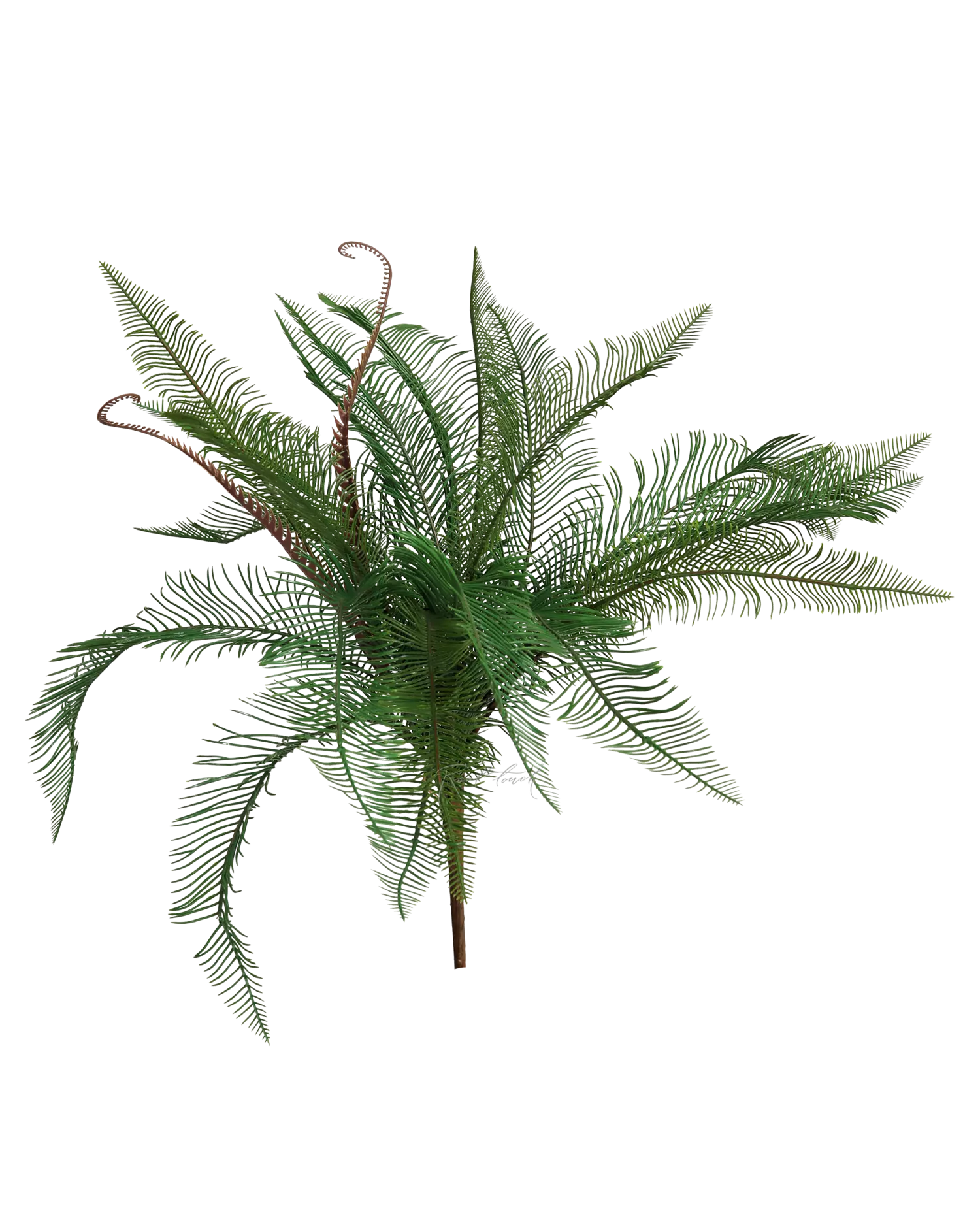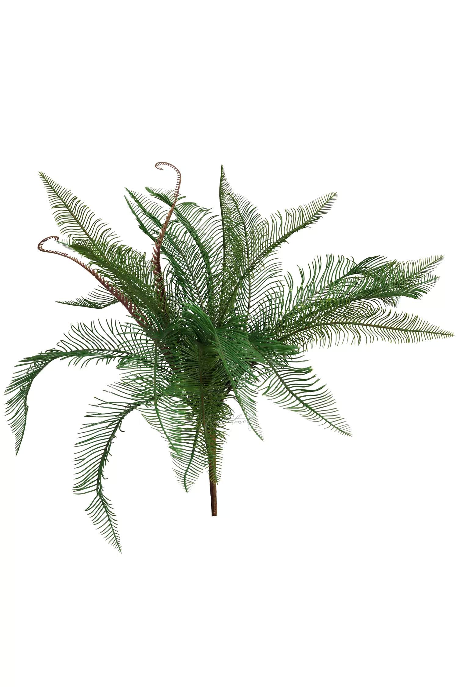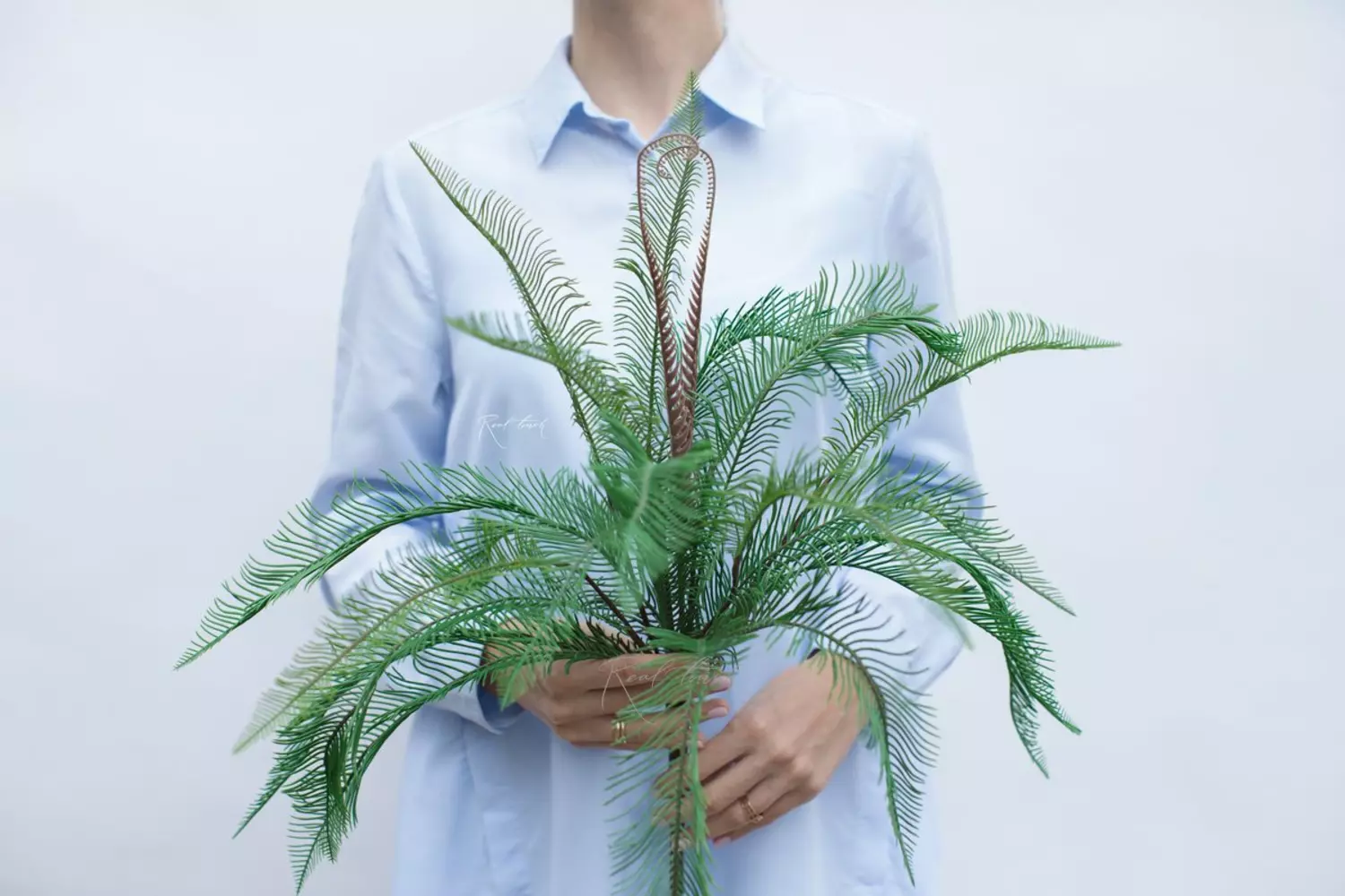 Особенности исполнения. Листья выполнены из плотного силикона с тонким «пером»; внутри заложена формообразующая проволока для аккуратного расправления и задания направления. Молодые коричневые «усики» (скрученные вайи) отлиты из пластика, поддерживают характерный вид блехнума. Стебель-основание — металлический стержень с бумажной оплёткой, на которую сведены все ответвления. Обращаем внимание! Бумажная оплётка требует бережного обращения: при многократной пересборке и трении может повреждаться. Листья гнутся и фиксируют форму в пределах заложенного проволочного каркаса; излишние перегибы у основания не рекомендуются. При необходимости композицию можно разобрать на отдельные листочки.