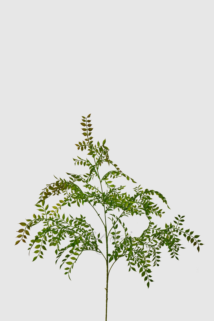 Мелкие листочки из мягкого пластика обладают детальной текстурой и реалистичными очертаниями, что делает ветку практически неотличимой от живого растения. Каждый листик имеет плавные края и тонкую проработку, благодаря чему ветка смотрится воздушно и утончённо. Листья равномерно распределены по многочисленным тонким ответвлениям, создавая объёмную и пышную структуру.
