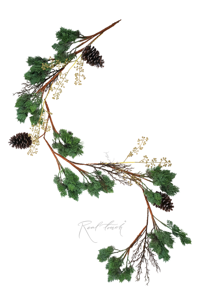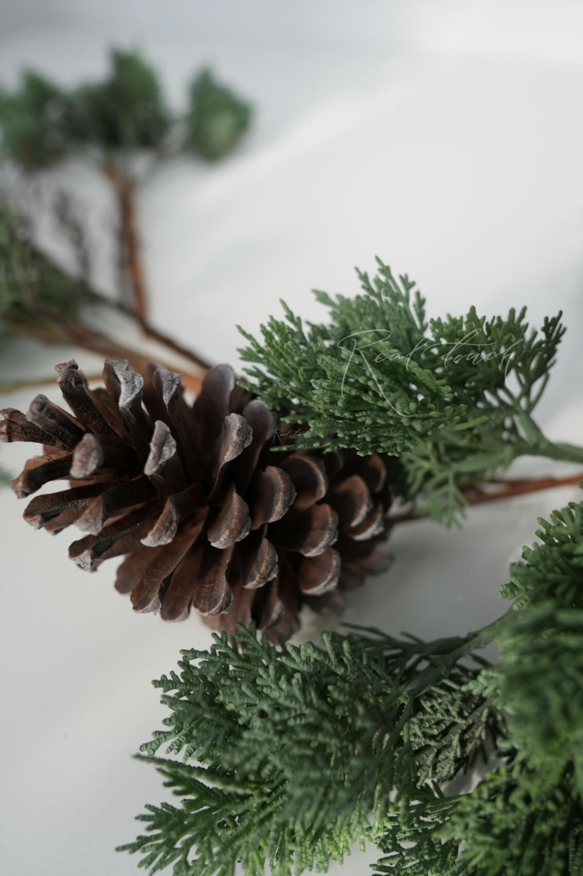 Ответвления состоят из хвойных веточек можжевельника сине-зеленого цвета. Веточки выполнены из мягкого пластика - пушистые и объемные, они отлично передают текстуру хвои. Также в ответвлении есть пластмассовые веточки с ягодами. Ягоды имеют бледно-зеленый цвет и небольшие коричневые вкрапления, а также на них присутствует приятное, матовое напыление. В трех ответвлениях также присутствуют веточки-побеги, без хвои, темно-коричневого цвета и натуральные кедровые шишки большого размера. Все эти детали в сумме делают гирлянду максимально проработанной, детализированной и необычной!