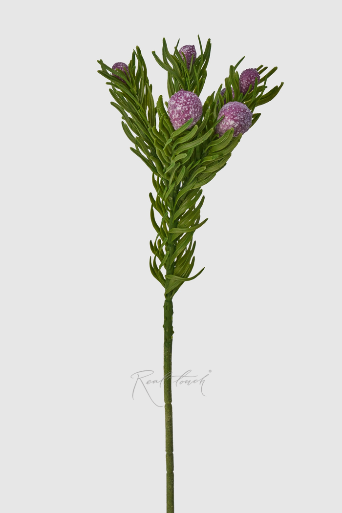 Бруния растет на лугах и опушках лесов. Небольшая веточка с ягодками, длиной 43 сантиметров. Имеет 5 ответвлений, на конце каждого яркие плоды. Веточки покрыты мелкими игловидными листиками. Плоды имеют неоднородный окрас. В нашем магазине есть несколько расцветок - фиолетовый и зеленый. Основной материал - мягкий пластик.
