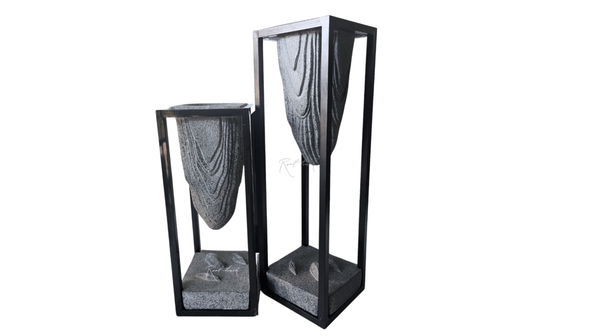 Кашпо состоит из двух частей : из металлического каркаса высотой в 90 см и вставки искусственного камня, глубина углубления 20 см