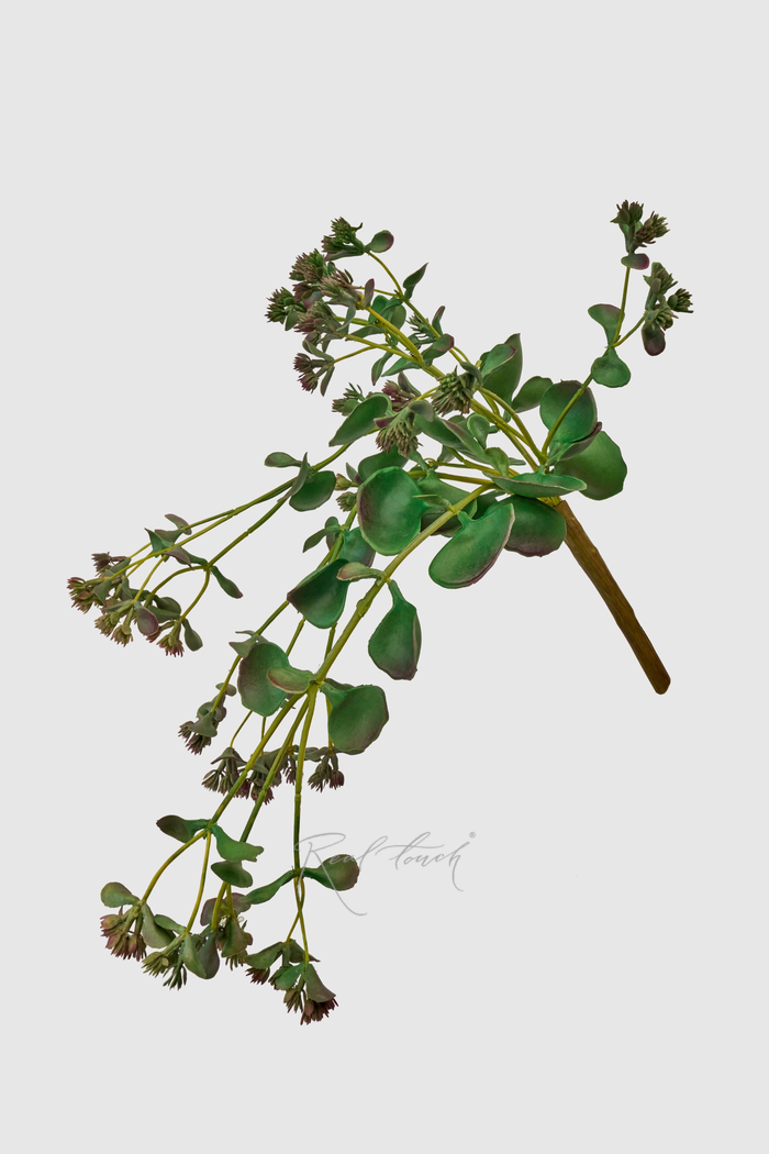 Очиток Зибольдая - это уникальное искусственное растение, созданное с использованием современных технологий и материалов. Детальная проработка элементов удивляет и притягивает. Немного напоминает нашу портулакарию афра. Очиток Real Touch точно имитирует живой суккулент, но при этом не требует ухода и полива, что делает его идеальным для использования в различных условиях. Его листья имеют насыщенный зеленый цвет с красноватой каемкой и красивую форму в виде гребешка, а соцветия миниатюрные насыщенного бордового оттенка. Длина 39, ножка 10см, ширина 25см. Материал - плотный силикон.