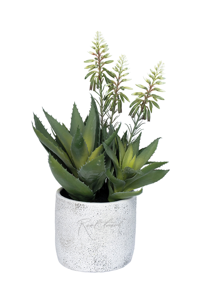 Состоит из нескольких кустиков алоэ, листочки имеют зазубренки окрашенные в темный цвет. Листья узкие плотные и мясистые. Высажено сразу в декоративное кашпо, под бетон, белого цвета. Имеет 3 отростка, с зелеными макушками. Основной материал - плотный силикон.