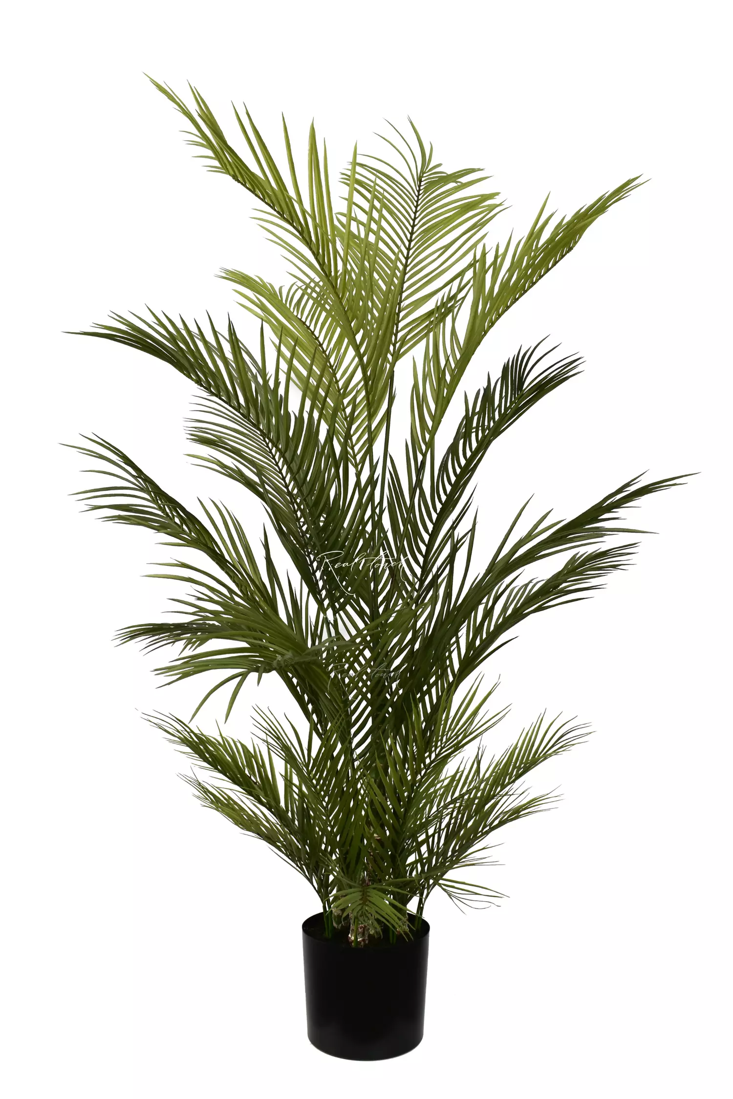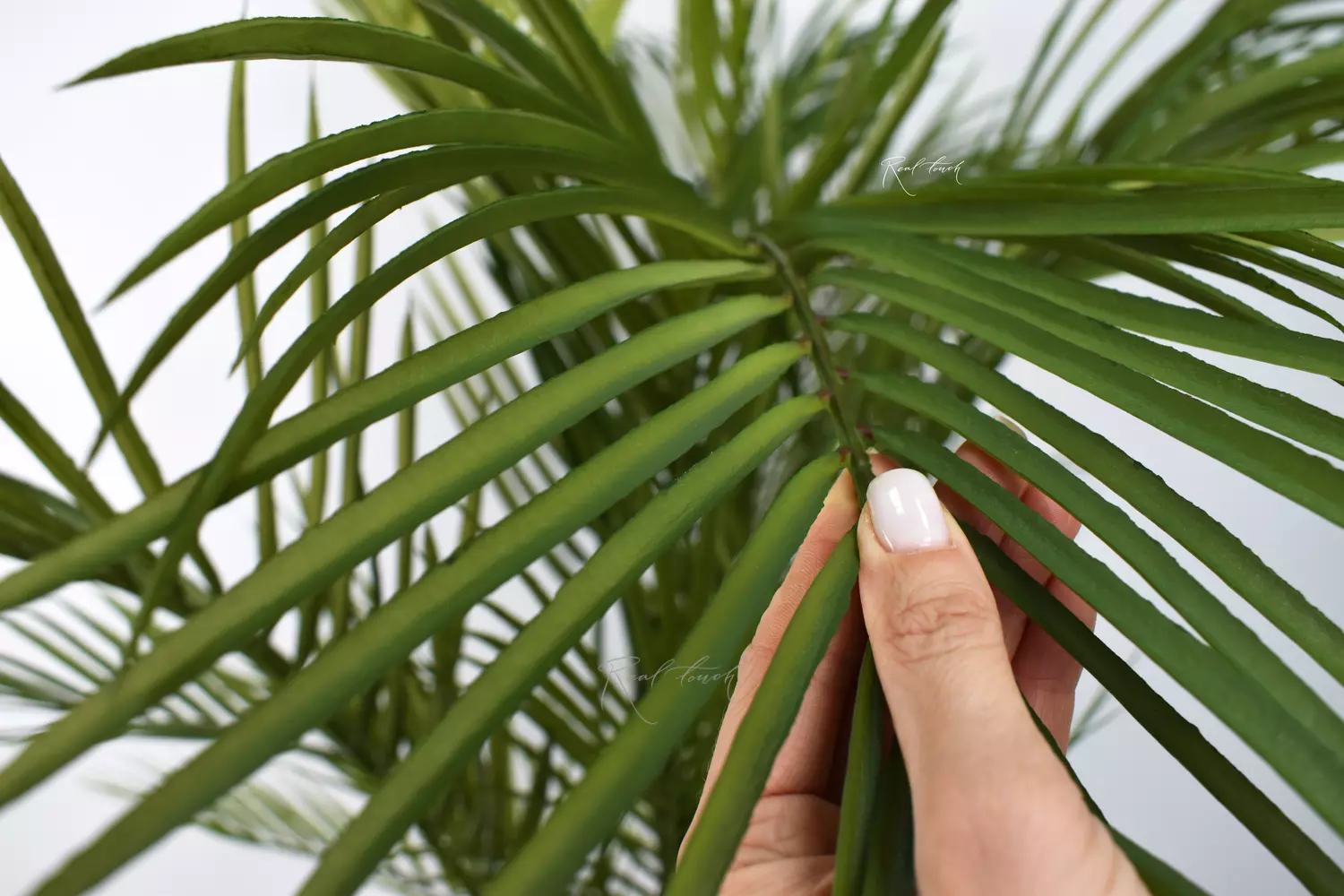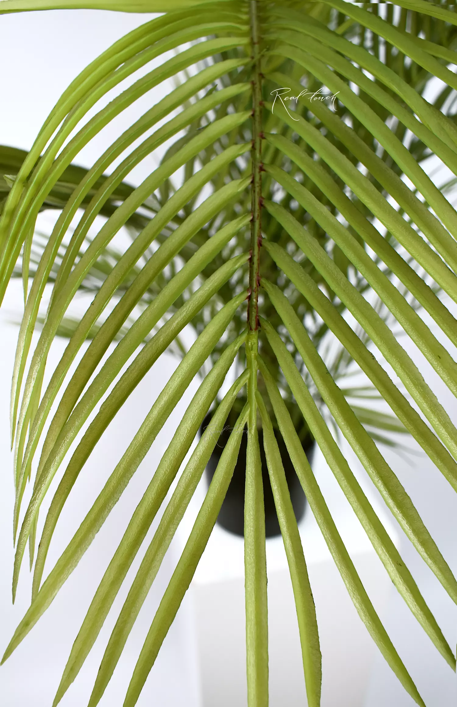 Листья пальмы выполнены из мягкого пластика, что обеспечивает их реалистичный вид и тактильные ощущения. Листва насыщенного светло-зеленого оттенка сверху кажется просвечивающейся на свету, а снизу она более темная - данная проработка добавляет естественности дереву. На меньших стеблях листочки тонкие, но прочные, а на крупных стволах — более плотные и широкие.