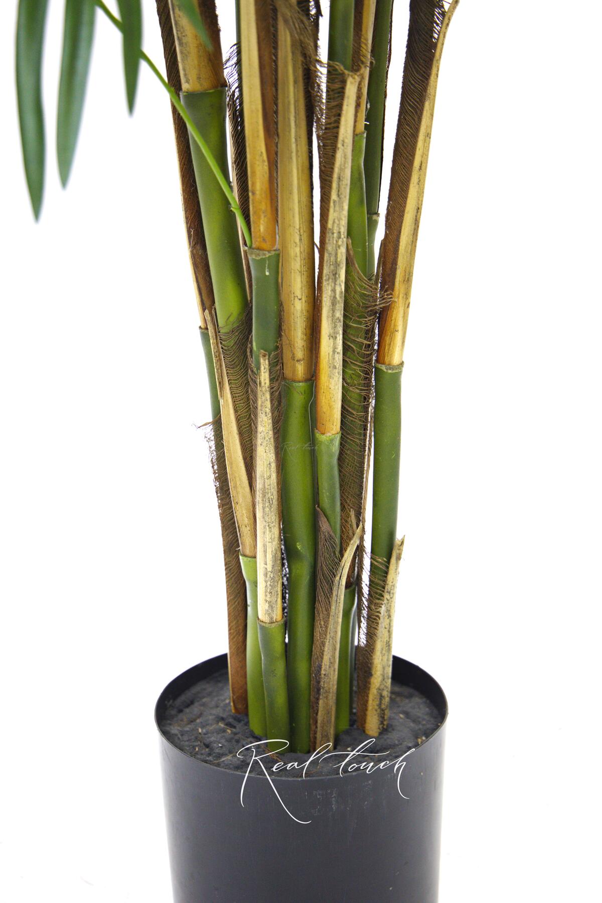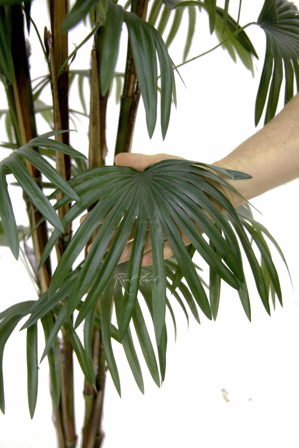 Пальма состоит из нескольких стволов, которые по строению слегка напоминают бамбуковые. Практически вдоль всего ствола растут листья. Они большие, темно-зеленого цвета, похожи на лапы или плавники, необычная форма притягивает взгляд и хочется прикоснуться, потрогать. У листа есть сердцевина, от которой идут лучи, они слегка изгибаются и свисают, делая дерево более текучим. Кажется, что вот сейчас пойдет дождь и с каждой дорожки на листе побежит свой маленький водопад. Листья выполнены из текстиля без печати, что делает лист более ровным, спокойным. Пальма представлена в трех размерах 180/210/240см.