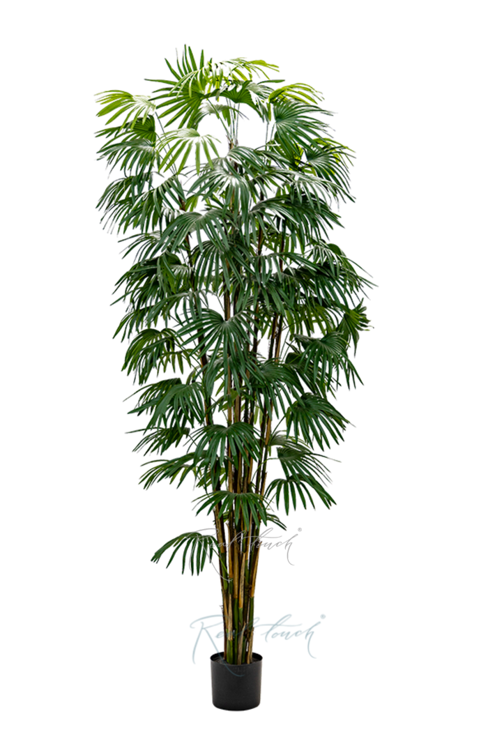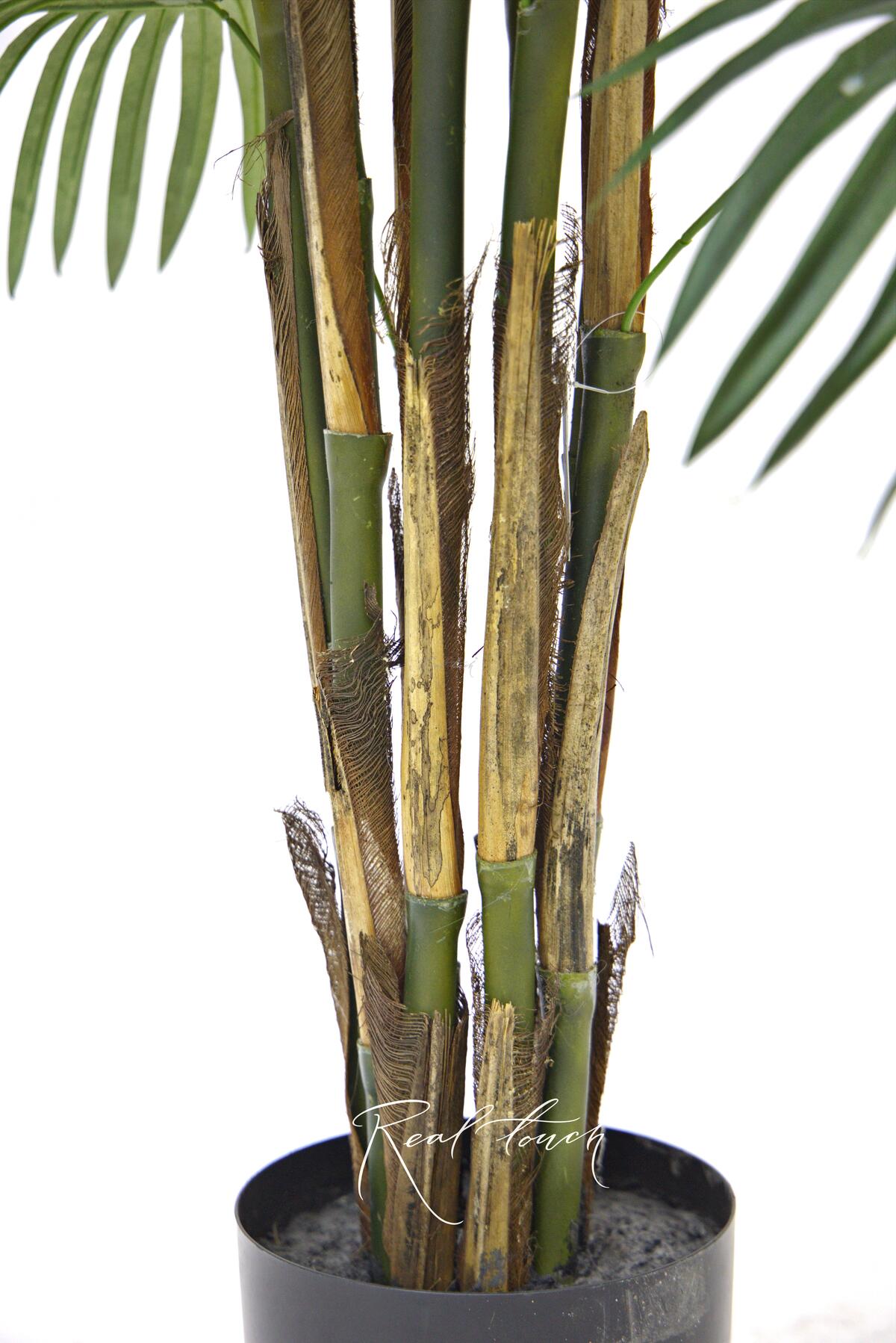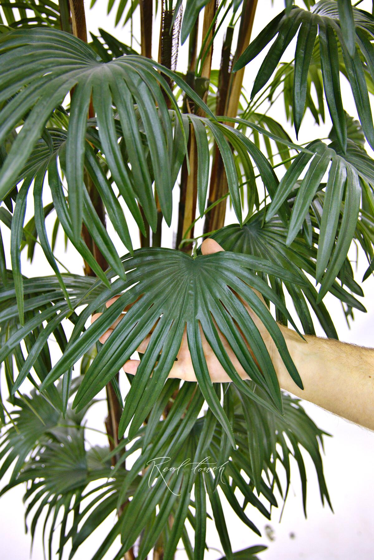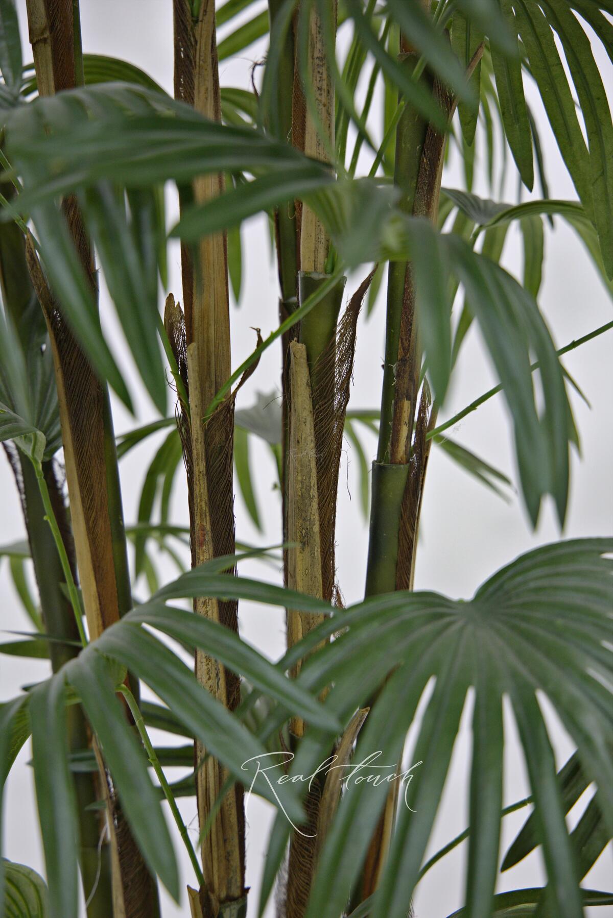 Пальма состоит из нескольких стволов, которые по строению слегка напоминают бамбуковые. Практически вдоль всего ствола растут листья. Они большие, темно-зеленого цвета, похожи на лапы или плавники, необычная форма притягивает взгляд и хочется прикоснуться, потрогать. У листа есть сердцевина, от которой идут лучи, они слегка изгибаются и свисают, делая дерево более текучим. Кажется, что вот сейчас пойдет дождь и с каждой дорожки на листе побежит свой маленький водопад. Листья выполнены из текстиля без печати, что делает лист более ровным, спокойным. Пальма представлена в трех размерах 180/210/240см.