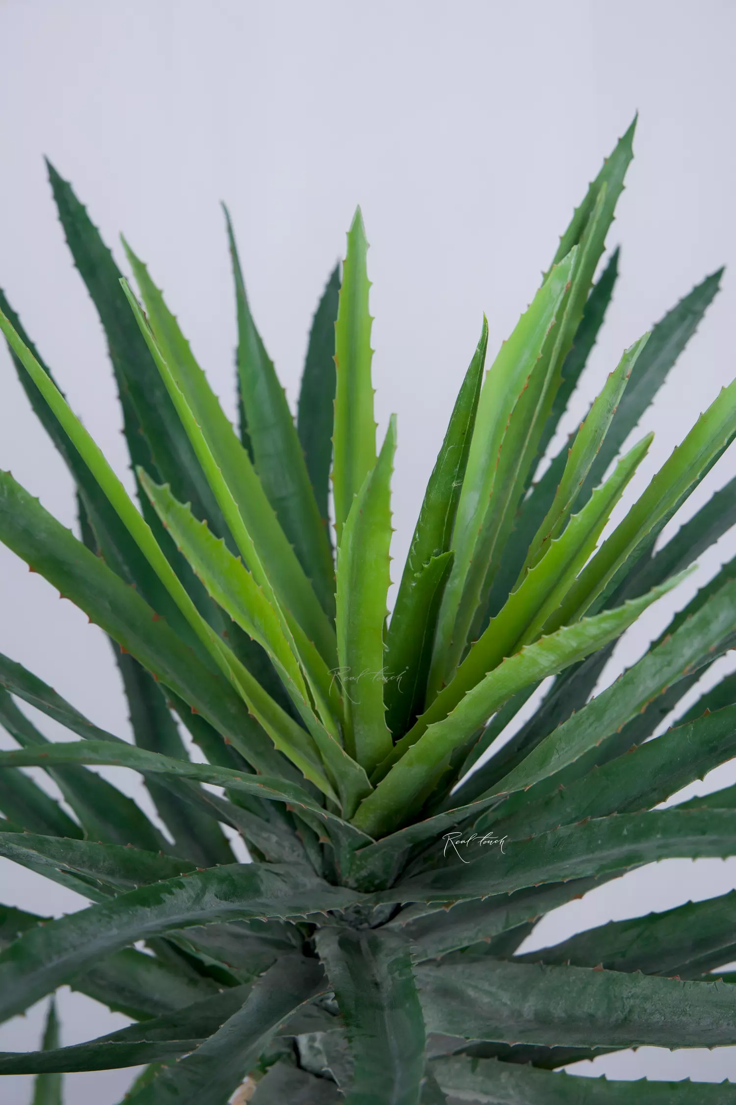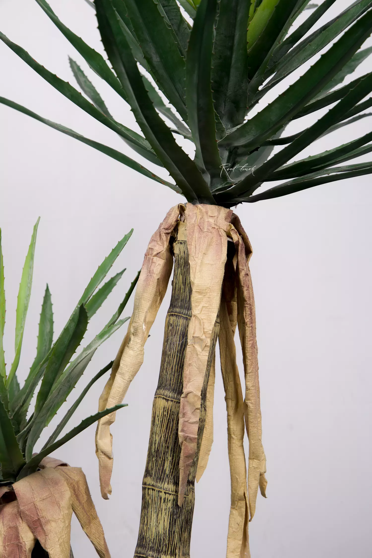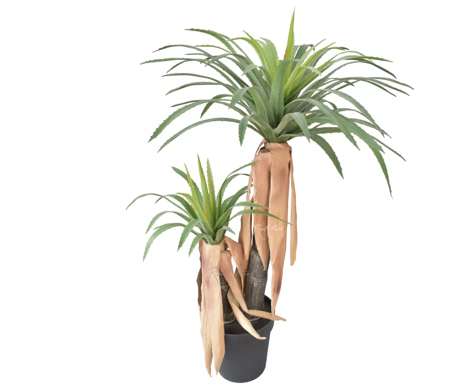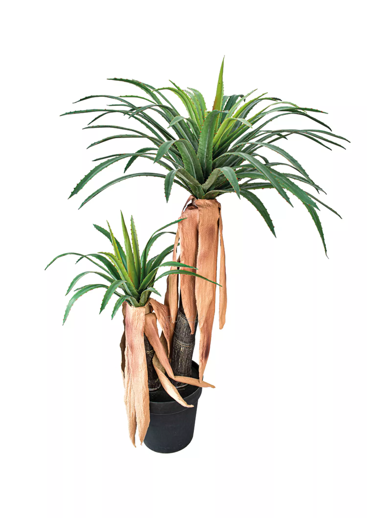 Пальма с двумя пластиковыми стволами разной высоты и “шапками” из узких зеленых листьев кинжаловидной формы с заостренным кончиком и небольшими зубчиками по краям. Материал – плотный силикон (PVC). Реалистичность этой юкке придает переход цвета от молодых более коротких и светлых листьев в центре до сухих старых листьев, свисающих вниз возле стволов.