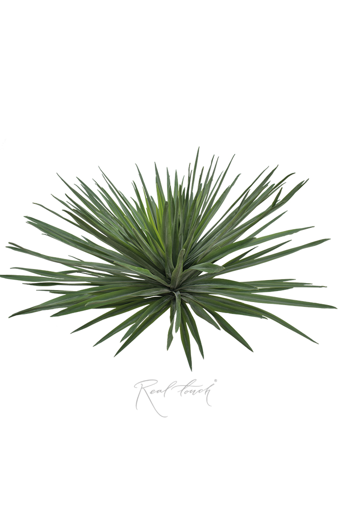 Юкка в виде пышной розетки из множества прямых узких листьев. Материал - плотный силикон. Листья зеленого цвета имеют переход от более светлого оттенка в центре к более темному, усиливая эффект напылением по всей длине листа. Внутри каждого листа есть металлический усилитель, удерживающий лист и позволяющий корректировать форму.