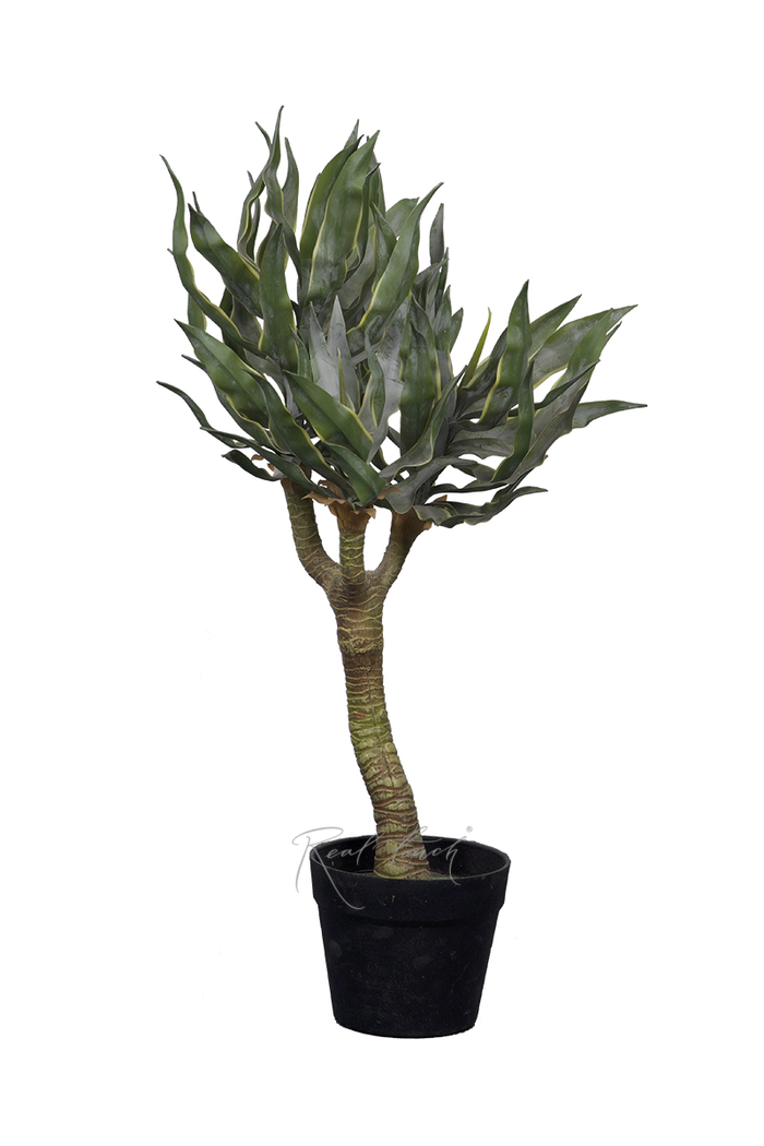 Данный вид юкки представлен в 3-х размерах. Также они отличаются количеством стволов и ответвлений от них и количеством розеток с листьями. Материал листьев – плотный силикон (PVC). Стволы рельефные, бежевого цвета. Листья зеленые с желтыми краями, имеют узкую, вытянутую, волнистую форму и острые концы. В каждом листе есть проволочка для коррекции раскрытия и волнистости листа. Между стволами и листьями есть короткие сухие листочки. На листья есть имитация белого напыления, которое делает цвет более сложным.
