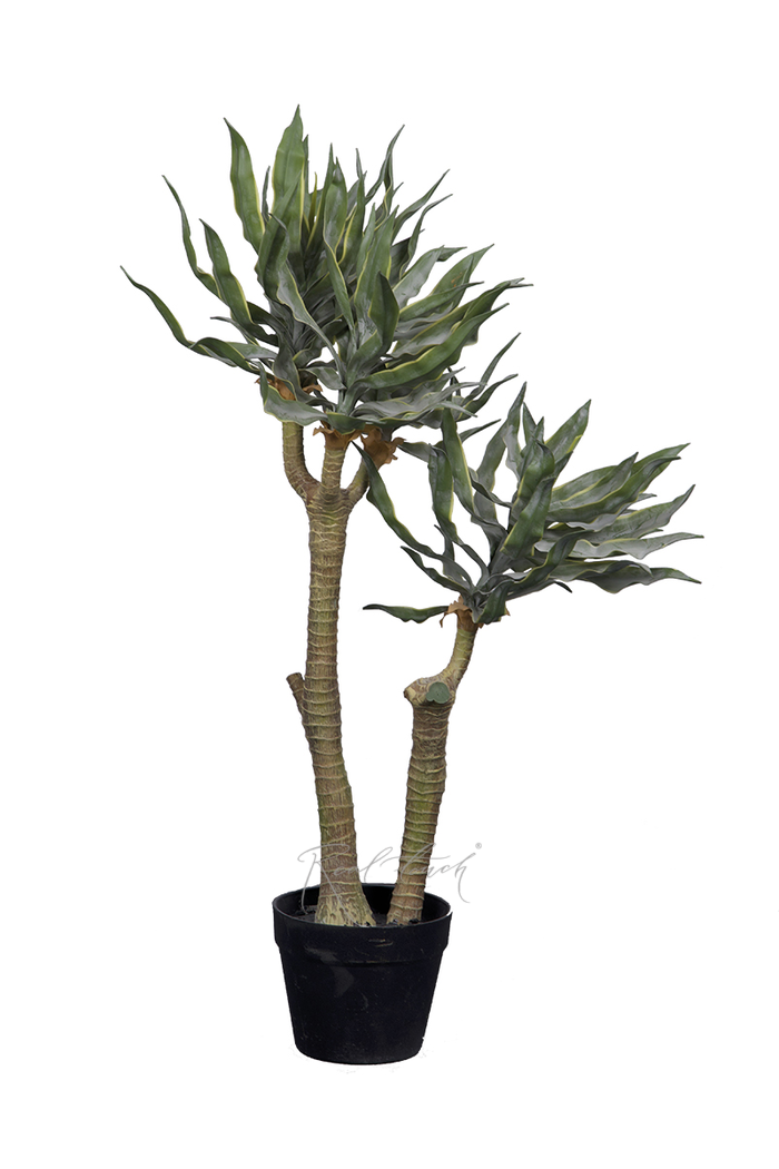 Данный вид юкки представлен в 3-х размерах. Также они отличаются количеством стволов и ответвлений от них и количеством розеток с листьями. Материал листьев – плотный силикон (PVC). Стволы рельефные, бежевого цвета. Листья зеленые с желтыми краями, имеют узкую, вытянутую, волнистую форму и острые концы. В каждом листе есть проволочка для коррекции раскрытия и волнистости листа. Между стволами и листьями есть короткие сухие листочки. На листья есть имитация белого напыления, которое делает цвет более сложным.