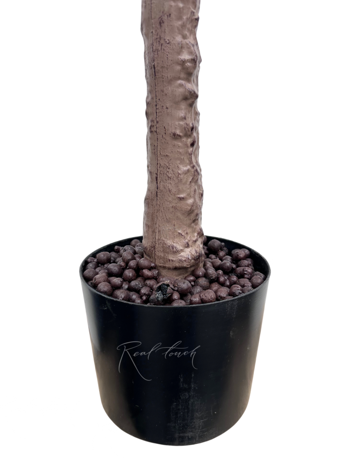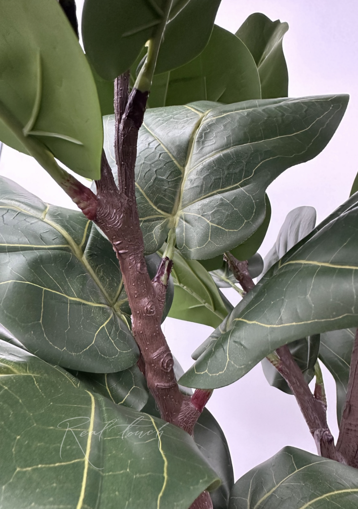 Коричневый ствол и его ответвления, выполненные из прочного пластика, имеют древесную неоднородную фактуру, словно у настоящего дерева. Внутри ответвлений проходит проволока, позволяющая задавать направление и объем растению. Все вышеперечисленные элементы проработки делают фикус реалистичным, как визуально, так и при прикосновении с ним.