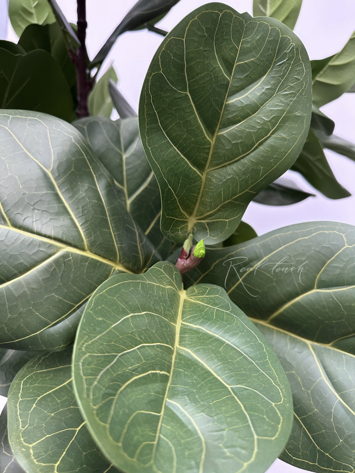 Дерево состоит из 5 основных ответвлений с крупными темно-зелеными листьями. Листья выполнены из водонепроницаемого полимерного волокна с 3D печатью прожилок и имеют сердцевидную форму. На каждом листе с обратной стороны имеются усилители, позволяющие держать лист. Окрас листов также передает реалистичность дерева в полном объеме - на зеленом листе заметны желтые тонкие прожилки, характерные для данного вида фикуса.