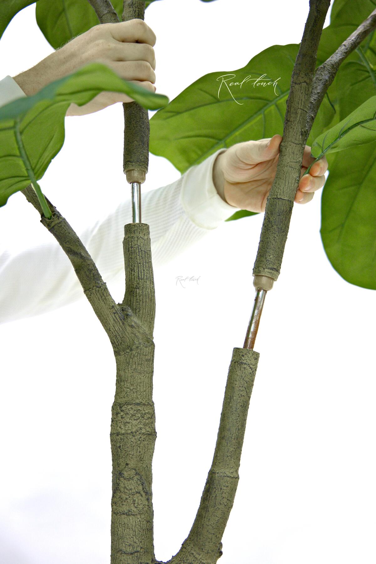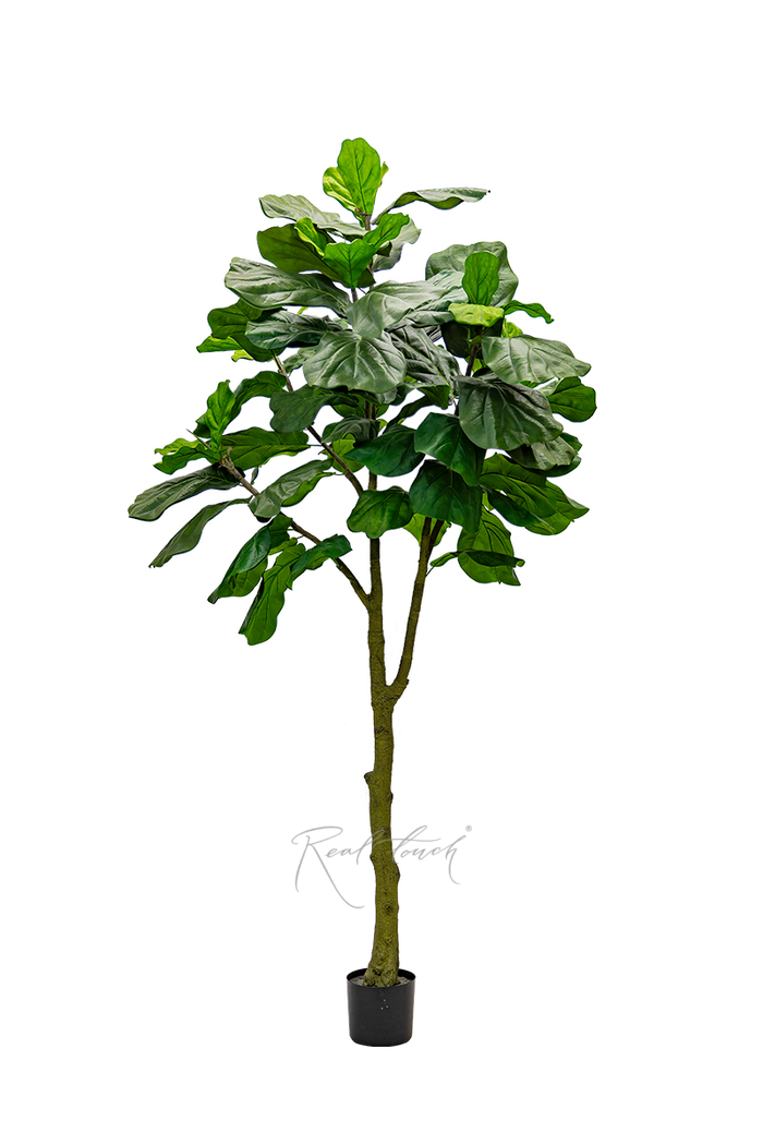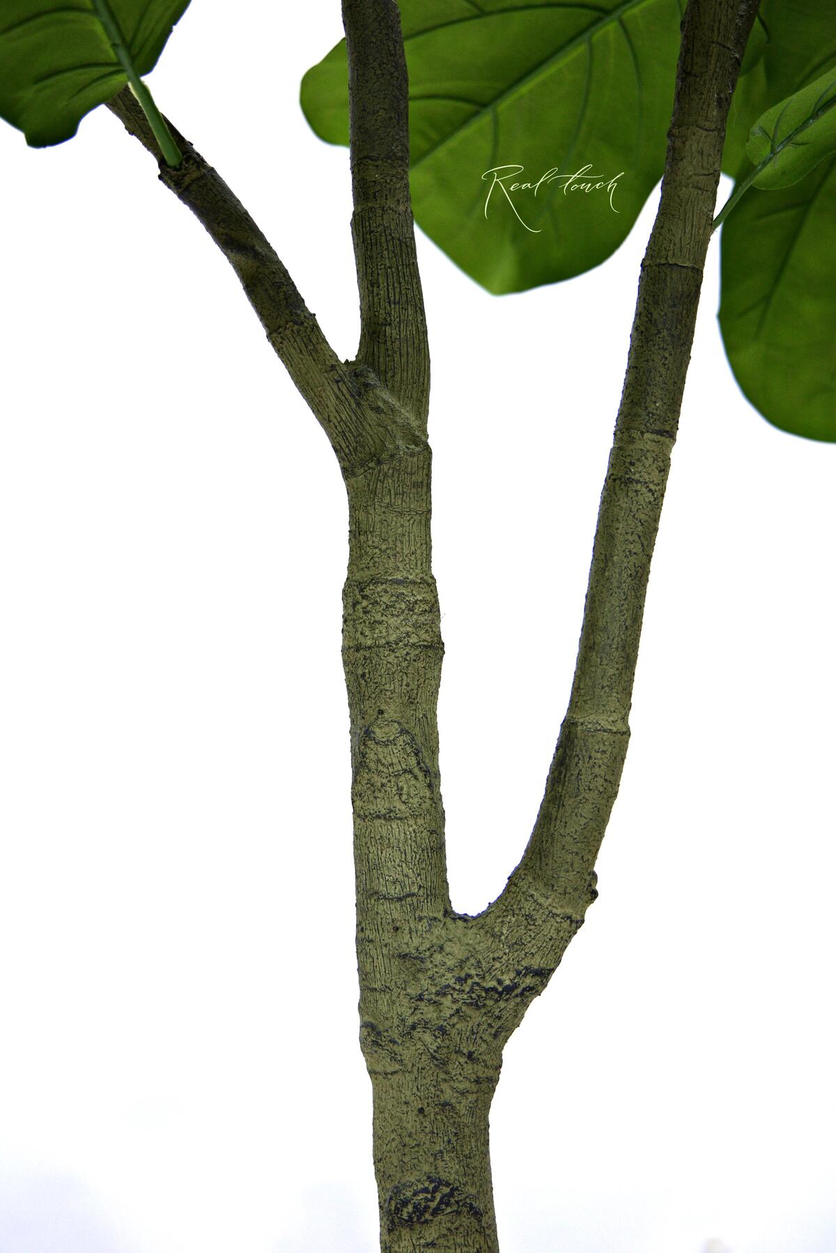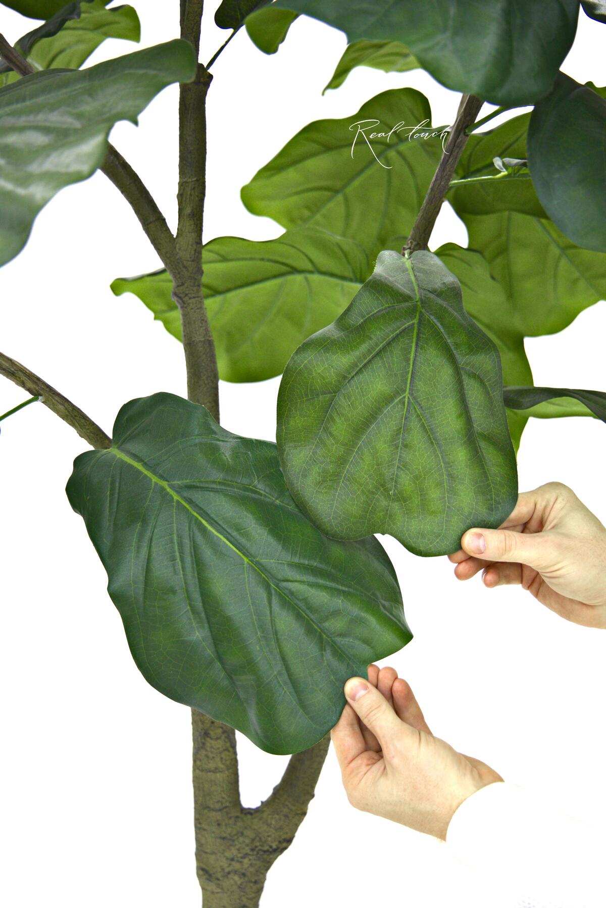 Фикус представлен в трех размерах 180/ 210/ 240см. Форма кроны отличается от привычной нам Лираты Real Touch, она более округлая и формируется крупными темно-зелеными листьями. Листья с гибким усилителем, который держит форму и изгиб, на них нанесена печать прожилок и есть переходы цвета, а также характерный подгиб края. Также для больше реалистичности сами листья разных размеров, разного оттенка зеленого и есть имитация неровности цвета, как у живого растения в природе. Ветки мягкие, гибкие, ствол реалистичный, но не является акцентом в данном дереве, на ощупь шершавый, как кора и более светлого оливкового оттенка.