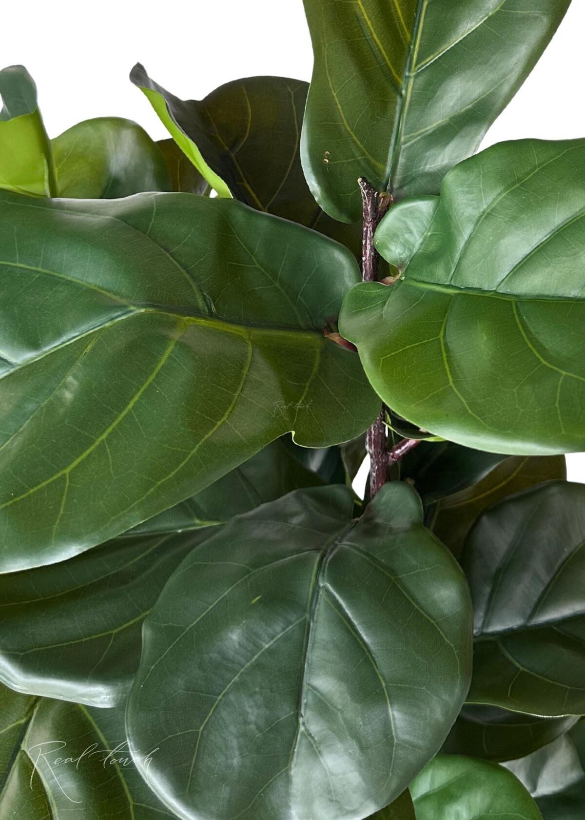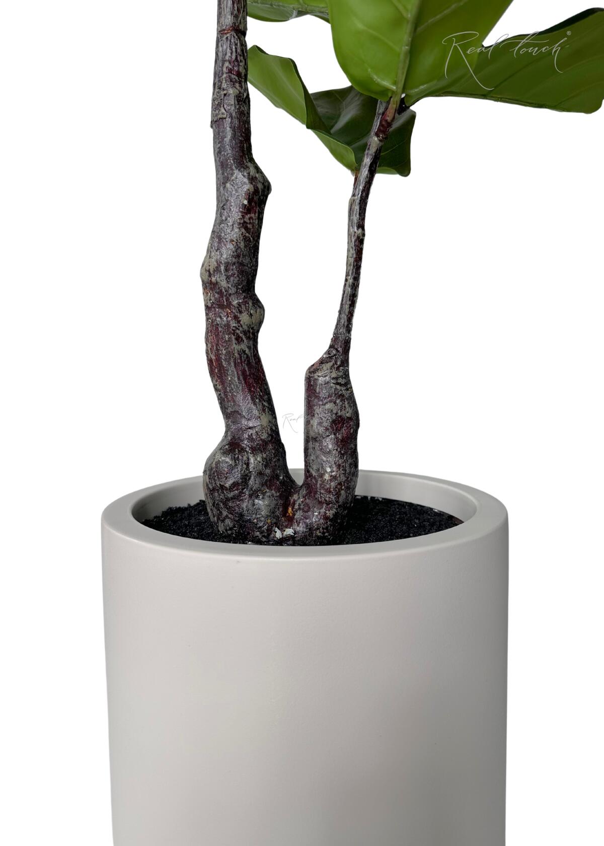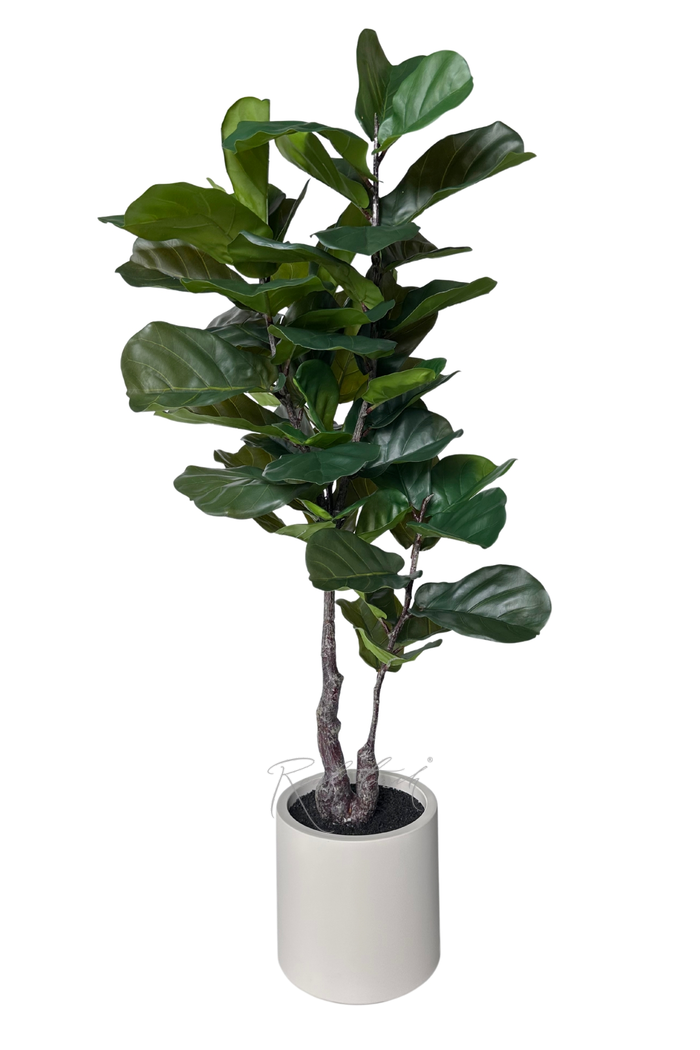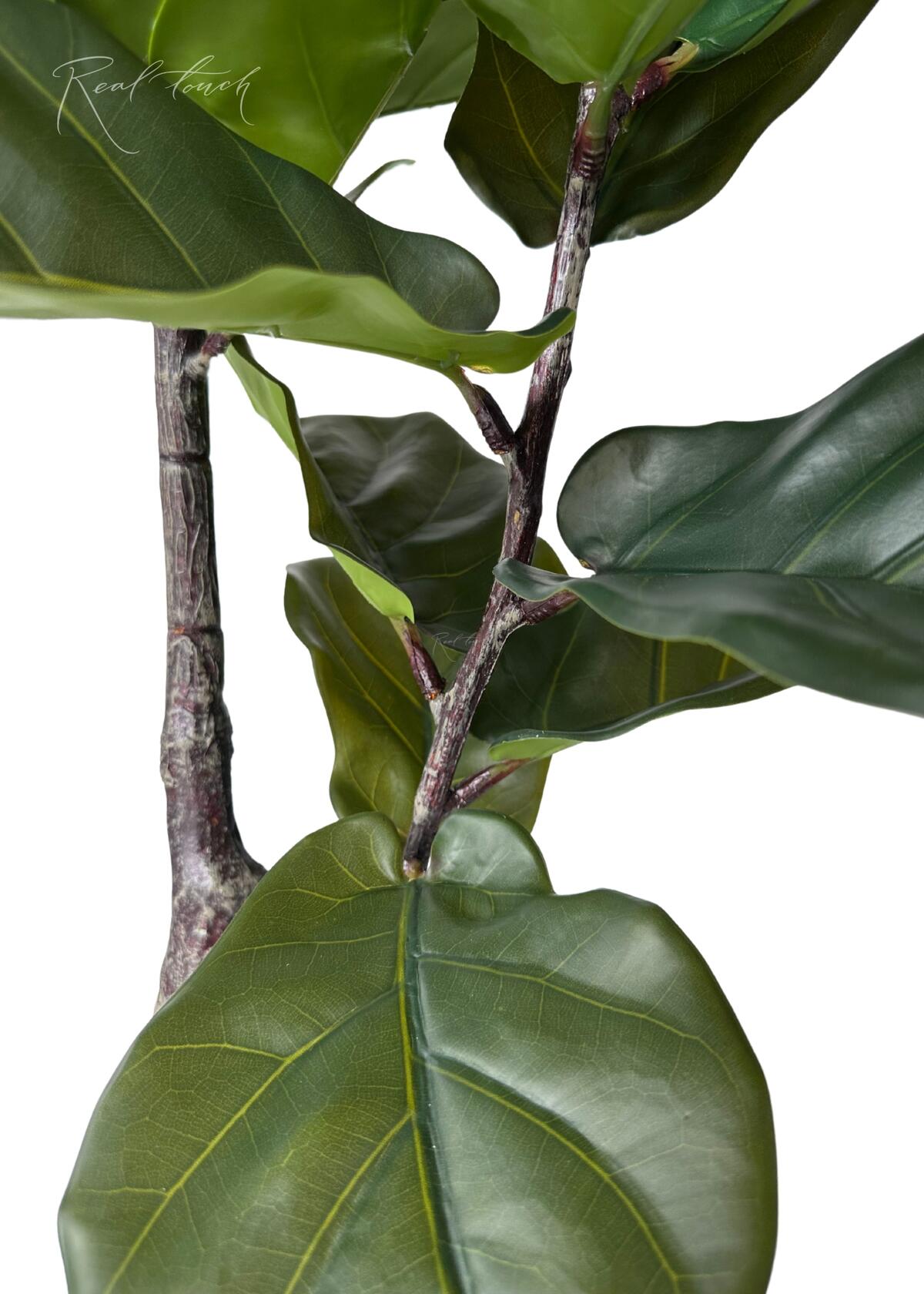 Фикус Лирата в декоративном кашпо — 145 см - стильный, эффектный и полный жизни! Этот фикус — идеальный выбор для тех, кто ценит эстетику, натуральность и уют. Он отлично впишется в современный интерьер, станет акцентным элементом гостиной, кабинета или просторной кухни, а также оживит офисное пространство. Фикус отличается детализированными листьями насыщенного тёмно-зелёного цвета. Листья изготовлены с применением 3D-печати на водонепроницаемом полимерном волокне, что делает их плотными, гладкими и невероятно натуральными. Прожилки листьев четко прорисованы, создавая реалистичную текстуру.