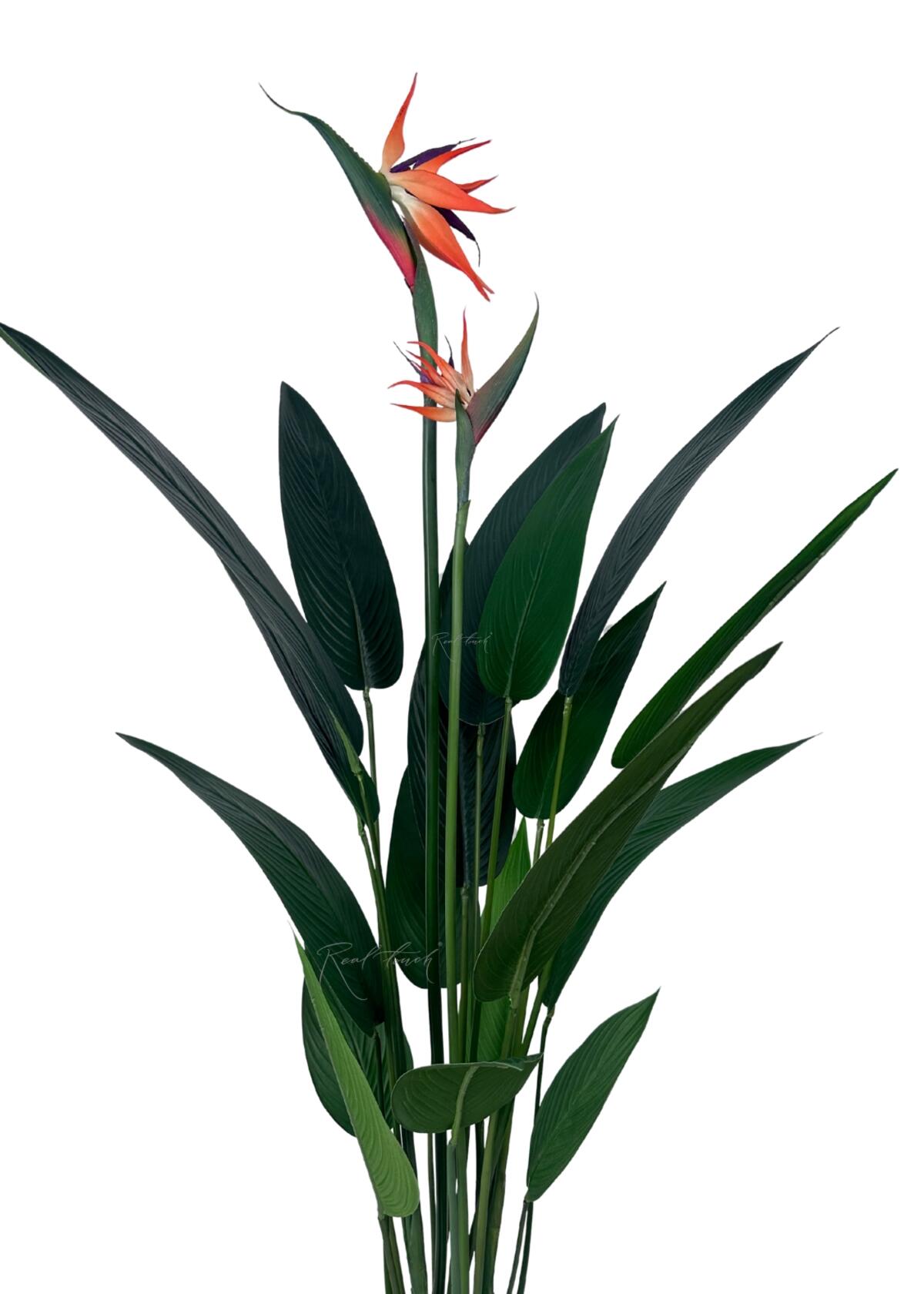 Высокий, раскидистый куст стрелиции с крупными листьями разного размера из очень плотного текстиля темно-зеленого цвета. В центре желто-красный цветок стрелиции. Листья вытянутой формы с легким полосатым рисунком на лицевой стороне. Все листья съемные и имеют металлическое основание. Благодаря этому их можно выгнуть и поменять местами для придания естественной формы. Листья прочно вставляются в множество стеблей-оснований.