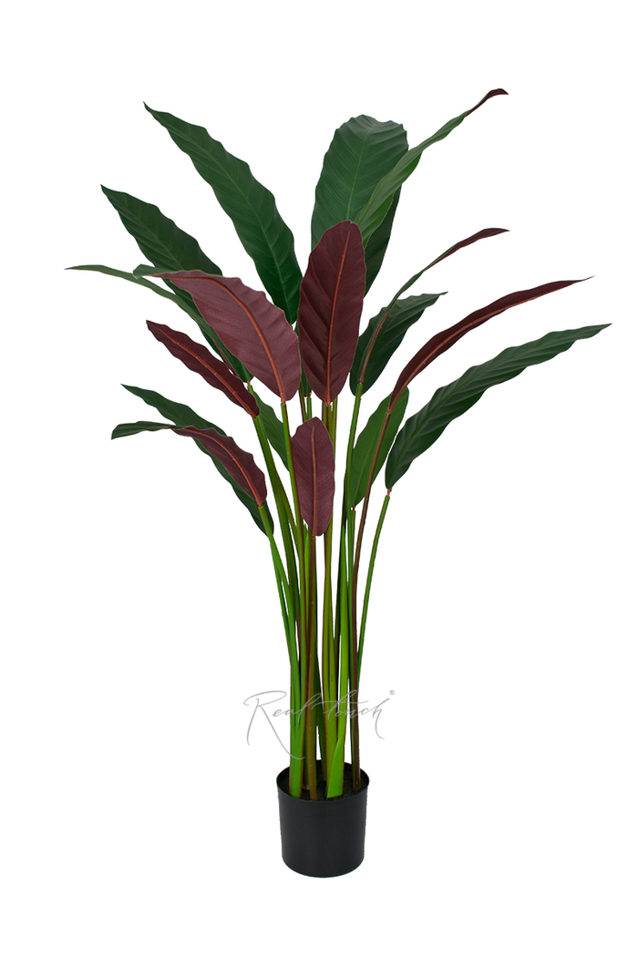Яркий куст Калатеи руфибарба привлекает внимание своей формой и окрасом. Узкие листья темно-зеленого цвета с бордовой обратной стороной. В листе есть проволока, которая позволяет его выгнуть и придать нужную форму. Каждый листик вынимается и при необходимости их можно поменять местами. Важно поставить лист плотно, чтобы он не выпадал и не было очевидным место стыка. Листочки смотрятся эффектно еще благодаря своей волнистой форме, свет играет на них пуская блики, а где-то падает тень. Материал – Текстиль с добавлением целлюлозы – аналогичен листьям наших стрелиций и обладает водоотталкивающими свойствами (но ставить их в водопады и купать не нужно). В кусте 18 листочков.