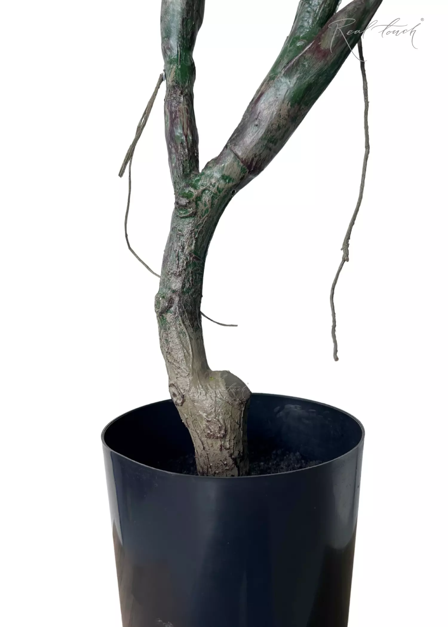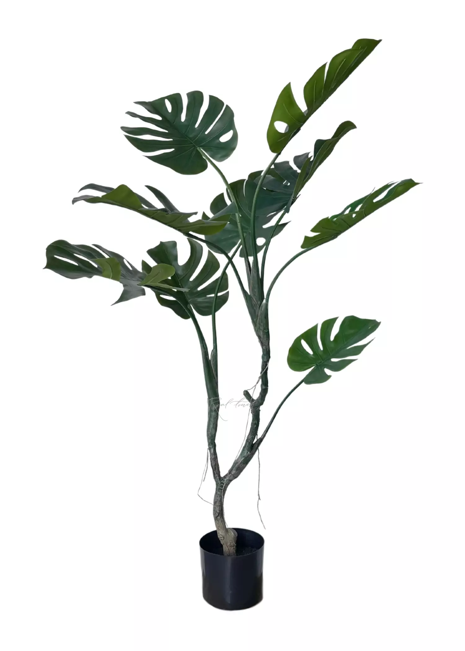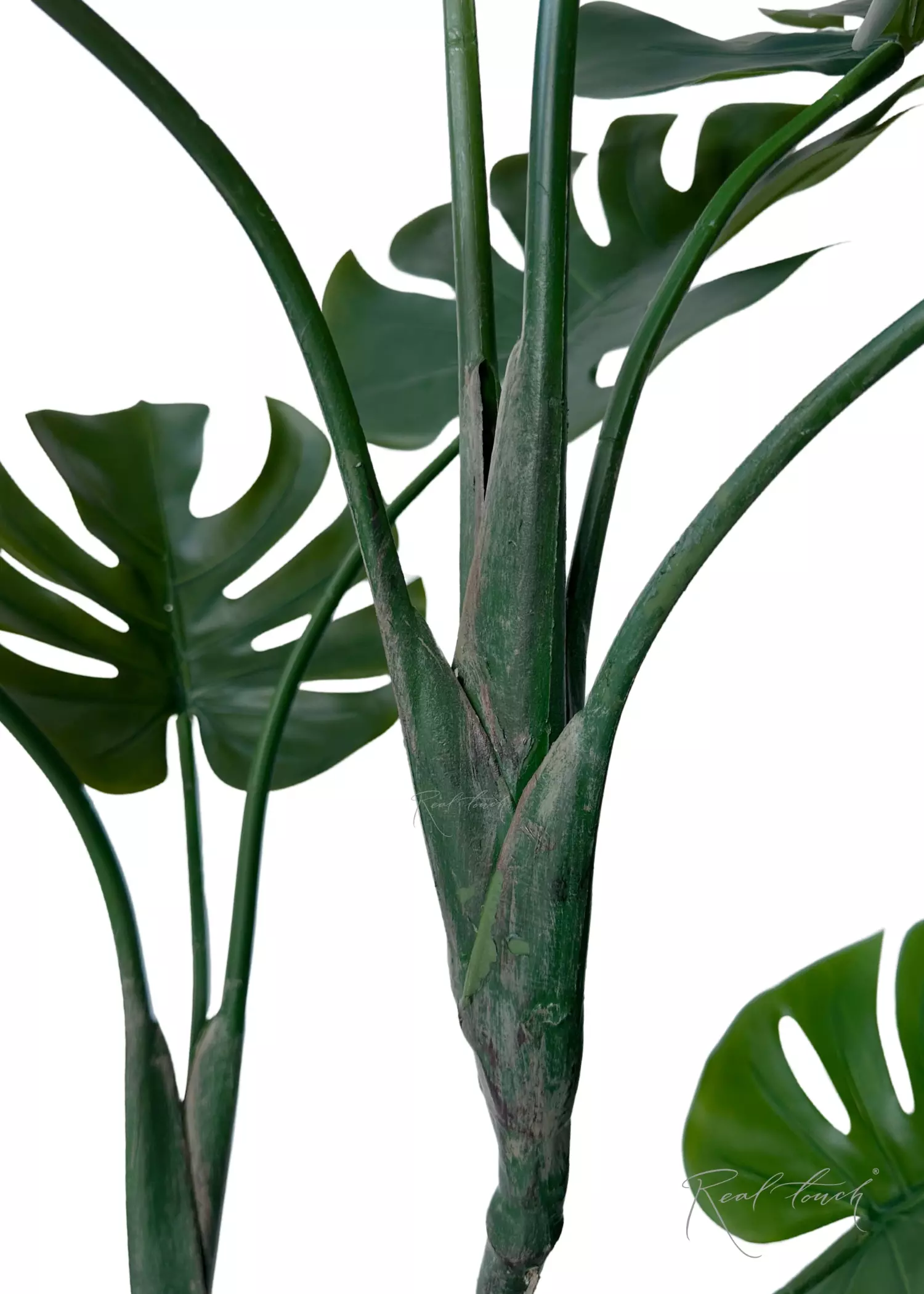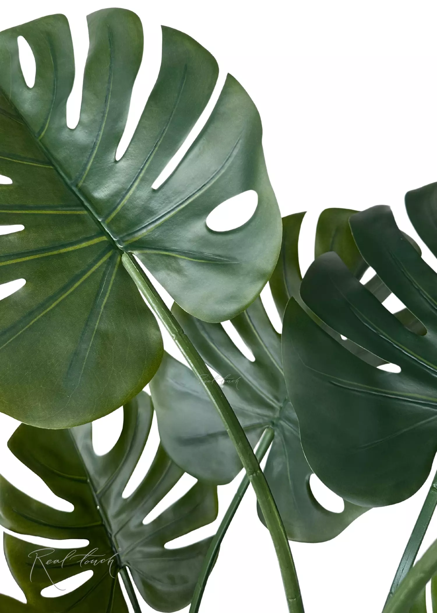Второй вид монстеры - это Монтера Лиана. От первого вида она отличается строением: один или два ствола, в зависимости от размера, со свисающими воздушными корнями. Материал - водонепроницаемое полотно с формовкой листа. Лист односторонний, у него есть обратная техническая сторона с усилителем, поэтому нужно хорошо расправить при установке. Ствол пластиковый, но при этом приятный на ощупь и визуально невероятно реалистичный. Лист не просто идет тонким стеблем, а будто в основании обнимает ствол и только потом утончается, превращаясь в стебель, переходящий в широкий лист. Очень изящное, необычное и привлекательное растение., которое подойдет для декора ресторанов, фитнес-центров, офисов и даже дома он дополнит интерьер и не будет скрадывать пространство.