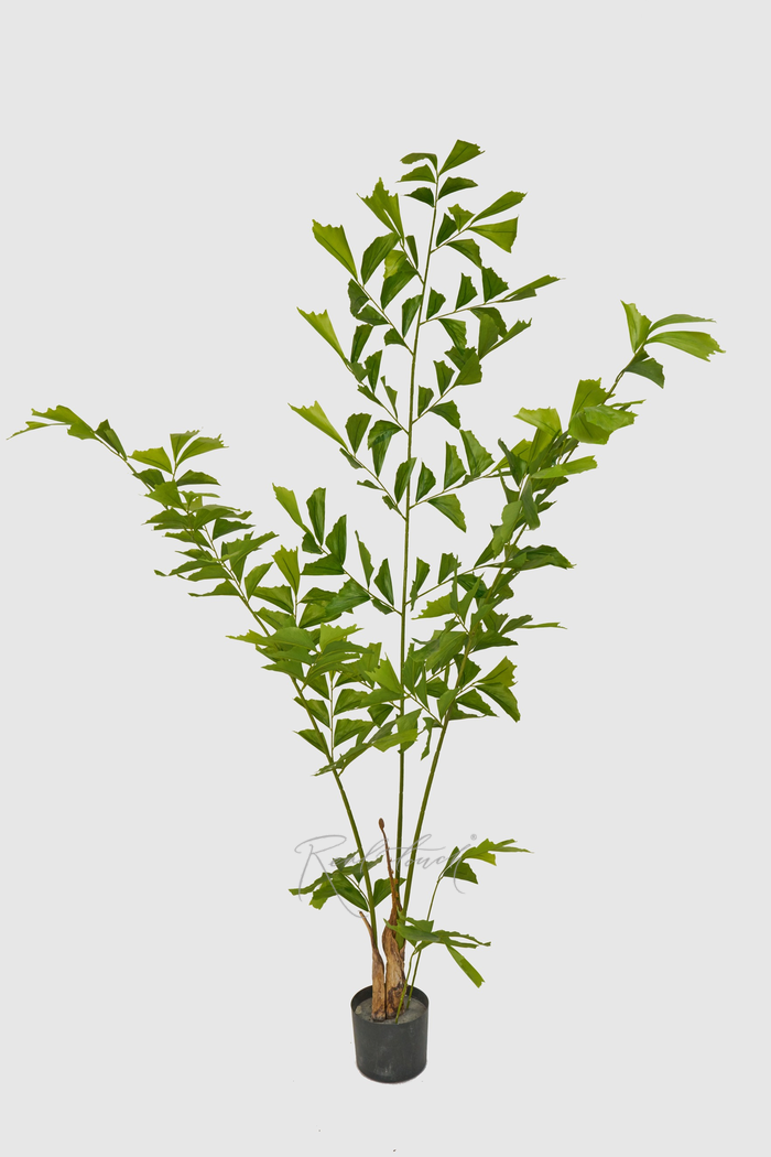 Пальма Кариота в техническом кашпо высотой 200 см с тонкими листочками светло-зеленого цвета. Листья из водонепроницаемого полимерного волокна имеют разный размер, полосатый рисунок, "рваные" края и прожилки от стеблей. Расправляются при помощи пара. Тонкие стебли из мягкого пластика легко выгибаются. Листочки не снимаются. У пальмы три маленьких и три больших ствола, украшенных натуральным сухостоем и искусственным побегом с завитком.